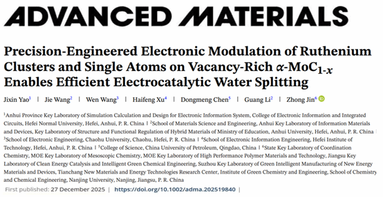 近日,电子信息与集成电路学院青年教师姚吉鑫及其合作团队在精密工程化电子调控核心技术方面取得突破性研究进展,相关研究成果以“Precision-Engineered Electronic Modulation of Ruthenium Clusters and Single Atoms on Vacancy-Rich α-MoC1-x Enables Efficient Electrocatalytic Water Splitting”为题,发表于材料科学顶级期刊《Advanced Materials》(自然指数期刊,中国科学院大类一区Top期刊,IF=26.8)。电子信息与集成电路学院姚吉鑫博士为第一作者,beat365唯一官方网站为第一署名单位。
