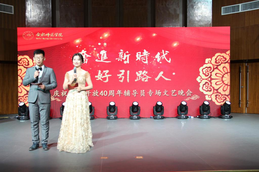 晚会以“奋进新时代 做好引路人”庆祝改革开放40周年为主题,聚焦辅导员职责使命,唱响主旋律,弘扬正能量,在《大中国》的欢快合唱中拉开帷幕。节目丰富多彩,时动时静、相得益彰,赢得了阵阵掌声,展示了辅导员队伍良好的精神面貌。乐曲弹唱《平凡之路》展现了辅导员立足平凡岗位,致力于不平凡的业绩的精神追求;舞蹈《爱莲说》舞出了辅导员对学生的深切期盼;朗诵《我的先生陶行知》聚焦行知文化,诉说了合师人对行知精神的不懈追求;歌曲串烧《唱响四十年》用了不同年代的歌曲,让大家打开记忆的闸门,分享四十年的甘苦;三句半《新时代辅导员》聚焦使命,立足职责,诙谐幽默地再现了辅导员的工作场景;诗朗诵《师之道》感人至深、意味悠长,表达了“学高为师、身正为范”的博大情怀;学生处全体成员合唱《明天会更好》,表达了对学生工作的憧憬与期待,情景剧《成长》展现了学生工作者对学生的深切关心,对未来的美好憧憬,朗诵《你好,辅导员》表达了辅导员对学生工作的热爱和对美好生活的祝愿。晚会在大合唱《不忘初心》《校歌》的歌声中圆满收官。
