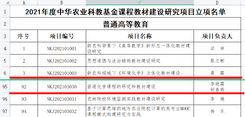 2022年12月5日,根据《关于开展2018年度中华农业科教基金教材建设研究项目结项暨2021年度中华农业科教基金课程教材建设研究项目申报工作的通知》《中华农业科教基金课程教材建设项目管理办法》及《中华农业科教基金课程教材建设研究项目评审办法》,中华农业科教基金会组织专家评审,146个普通高等教育项目准予立项,其中重点项目12个。beat365龚霞教授的“新农科视域下《环境化学》立体化教材建设”获得重点项目立项,李艳霞老师的“普通化学课程的研究和教材建设”获得立项。