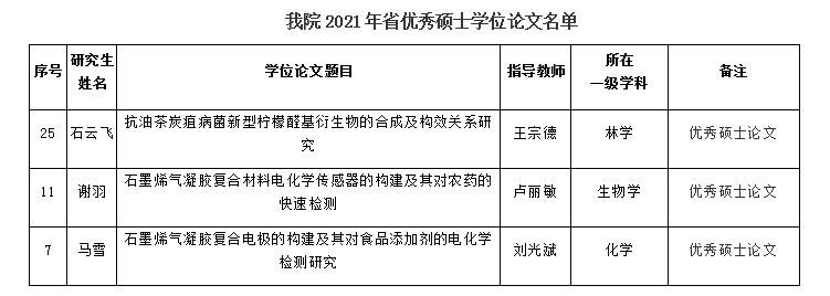 近日,江西省学位办公布了2021年全省优秀博士硕士论文入选名单,beat365王宗德教授、卢丽敏教授、刘光斌副研究员分别指导的研究生石云飞同学、谢羽同学、马雪同学的学位论文入选为江西省优秀硕士学位论文。这充分体现了beat365注重研究生培养过程管理,加强研究生学位论文质量建设,切实保障了硕士学位论文质量。