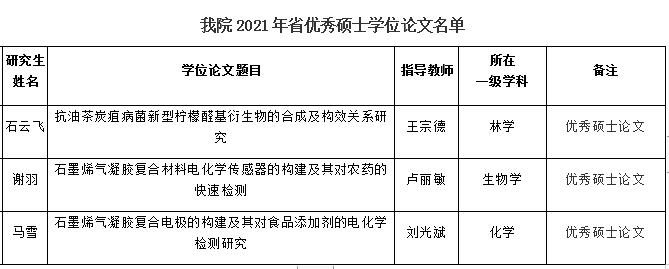近日,江西省学位办公布了2021年全省优秀博士硕士论文入选名单,beat365王宗德教授、卢丽敏教授、刘光斌副研究员分别指导的研究生石云飞同学、谢羽同学、马雪同学的学位论文入选为江西省优秀硕士学位论文。这充分体现了beat365注重研究生培养过程管理,加强研究生学位论文质量建设,切实保障了硕士学位论文质量。