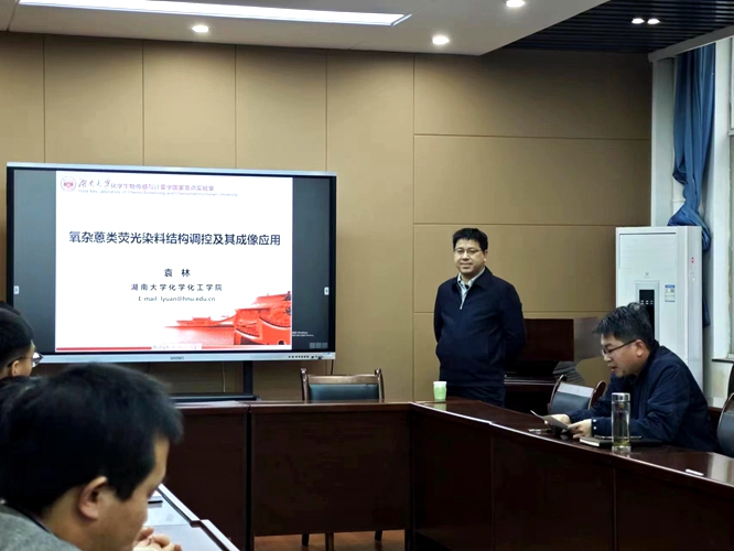 2023年11月24日下午3:00,湖南大学化学化工学院、化学生物传感与计量学国家重点实验室袁林教授受邀为化材学院师生作了一场主题为《氧杂蒽类荧光染料结构调控及其传感与成像应用》的精彩报告。报告由副院长卢丽敏教授主持,化材学院部分老师、全体硕士研究生参加此次报告。