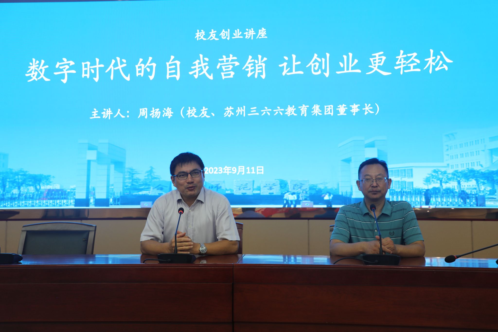 11日晚,学院在锦绣校区举办了周扬海校友创业讲座,讲座由院党委委员、副院长周端明主持,就业创业工作处处长李健、发展规划处(校友办)副处长樊彩萍及近百名相关专业学生代表参加。