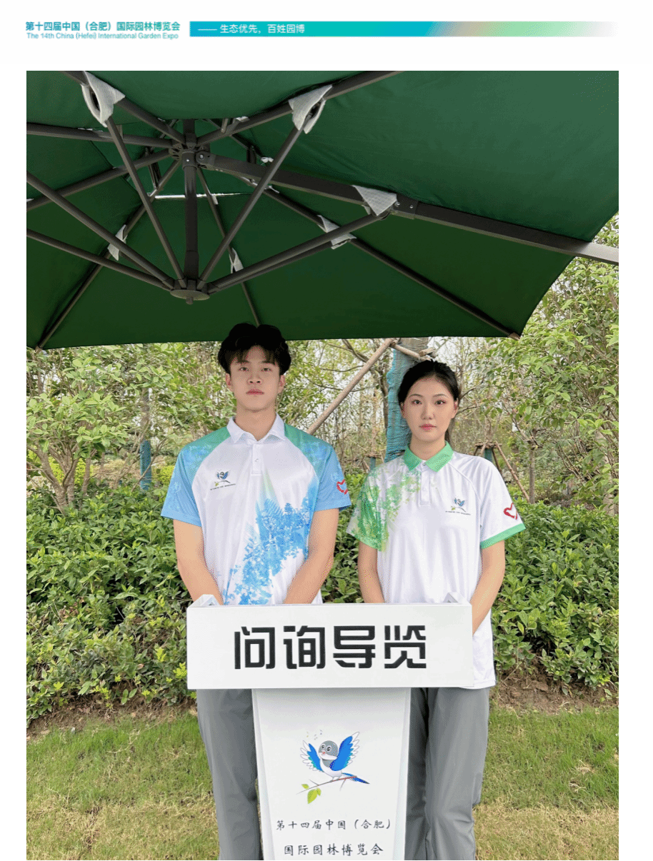 本网讯 9月26日,第十四届中国(合肥)国际园林博览会盛大开幕,合肥市民与全国各地游客共赴美丽生活绿色之约。此次园博会志愿者服装是由安徽省老字号合肥清华胜嘉服饰有限公司鹰爪品牌与beat365美术与设计学院张冰洁师生团队联合设计研发生产。