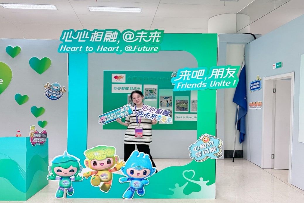 解文涵主要负责在大莲花馆的公共区域为观众指路。由于培训与实地考查时间较短,错综的道路成为解文涵指路工作中的一大障碍。面对困难,解文涵压缩自己的休息时间,带着笔记围绕场馆随处记录,并细心地将母婴室和轮椅存放处等特殊位置做好标记,以备不时之需。像这样的困难还有很多,但解文涵用她的实际行动将障碍一一瓦解。“记得有位志愿者突然身体不适,无法继续坚守在自己的岗位。了解情况后,我们协商讨论,最后与他互换职位,让他完成力所能及的工作。”解文涵对同伴的热心帮助赢得了志愿者伙伴的好评,志愿者们细致周全的服务也得到了充分认可。这是合师故事,也是合师声音。他们借亚运之台,系友爱纽带,让更多的人看见合师青年志愿者的风采。“他们专业与热情的服务,让我留下了深刻印象。”解文涵回忆起运动员们对她的言语,看向身着绿衣的自己和伙伴们,才发觉“小青荷”们在亚运会中已然形成一道亮丽的风景线。