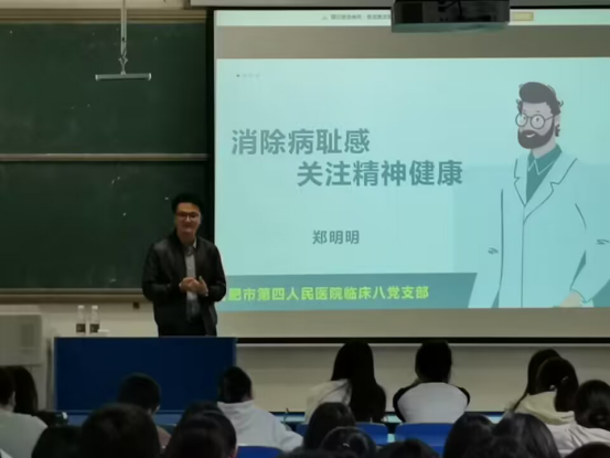 在本次宣传周中,学院首次开展“心理医生进校园”主题活动,邀请安徽精神卫生中心精神科主治医师郑明明和安徽医科大学附属巢湖医院精神科副主任医师宋苏琪来院开展精神卫生主题讲座。郑明明以“消除病耻感,关注精神健康”为主题,从常见的精神卫生现象引入,向同学们讲解了精神卫生的相关概念、心理疾病的成因以及心理疾病的症状表现,并通过丰富的临床案例科普了心理疾病治疗的必要性以及可治愈性,最后就睡眠障碍、抑郁症等常见精神心理问题的识别和应对方式进行了科普宣教。宋苏琪以“与焦虑和解”为题,向同学们讲诉了焦虑情绪的生理和心理表现、焦虑与焦虑症的区别与联系以及缓解焦虑情绪“加减法”技术,最后运用正念技术带领同学们体会缓解焦虑情绪的方法。本次“心理医生进校园”活动,全校400余名学生参加,现场氛围热烈,同学们认真听讲,反馈良好,并期待学院开展更多类似的讲座活动。