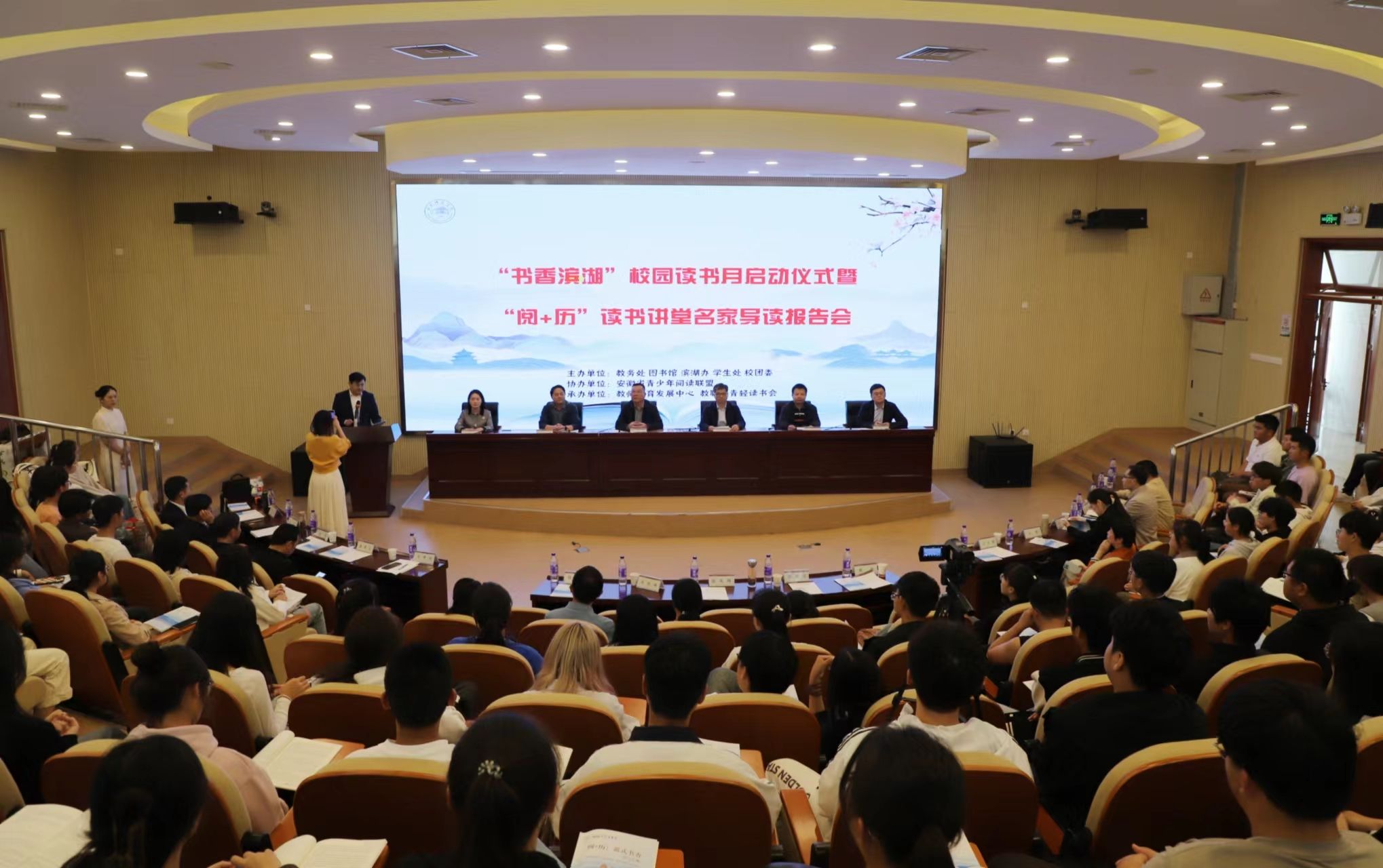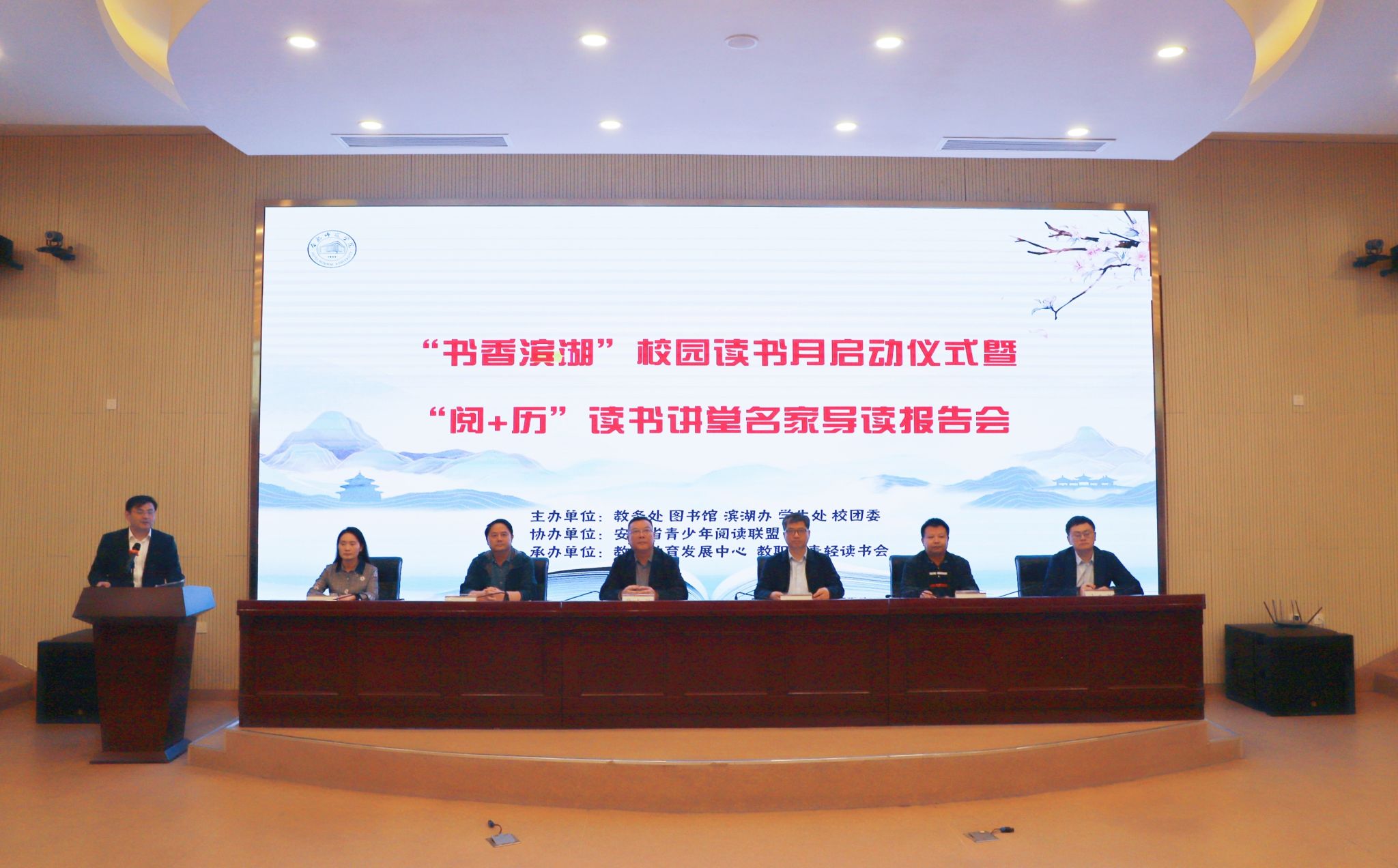 10月11日下午,学院以“以文培院、立心铸魂、书香筑梦、文润校园”为主题,在滨湖校区多功能报告厅举办“书香滨湖”校园读书月启动仪式暨“阅+历”读书讲堂第二场名家导读报告会。党委书记徐成钢,党委委员、副院长华银峰,党委委员、宣传部、统战部部长常树宝,教务处、学生工作处、滨湖校区综合管理办公室、图书馆等部门负责人,相关二级学院领导及师生代表200多人参加了活动。启动仪式由教务处处长钱立青主持。