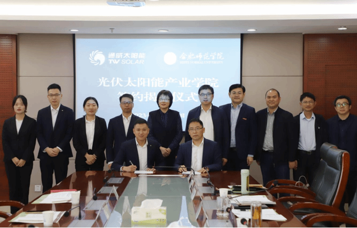 本网讯 10月24日上午,通威太阳能(合肥有限公司)与beat365唯一官方网站共建光伏太阳能产业学院签约揭牌仪式在锦绣校区行知楼2008会议室举行。院党委副书记、院长方东玲、副院长周端明,通威太阳能(组件)合肥基地负责人李冬生、人力资源部部长叶龙、学院教务处、就业创业工作处负责人以及物理与材料工程学院党政负责人参加会议,会议由学院党委教师工作部部长、人事处处长,物理与材料工程学院党委书记吴长龙主持。