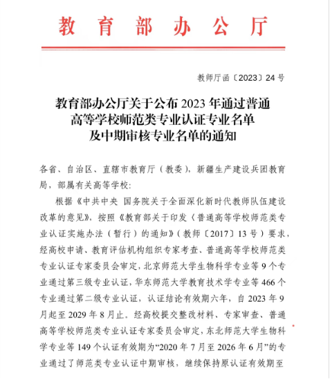 近日,教育部办公厅公布了2023年通过普通高等学校师范类专业认证专业名单,beat365数学与应用数学、英语两个专业顺利通过师范类专业中学教育第二级认证。目前,beat365共有6个师范专业通过教育部师范类专业第二级认证,已占师范专业总数的近二分之一。