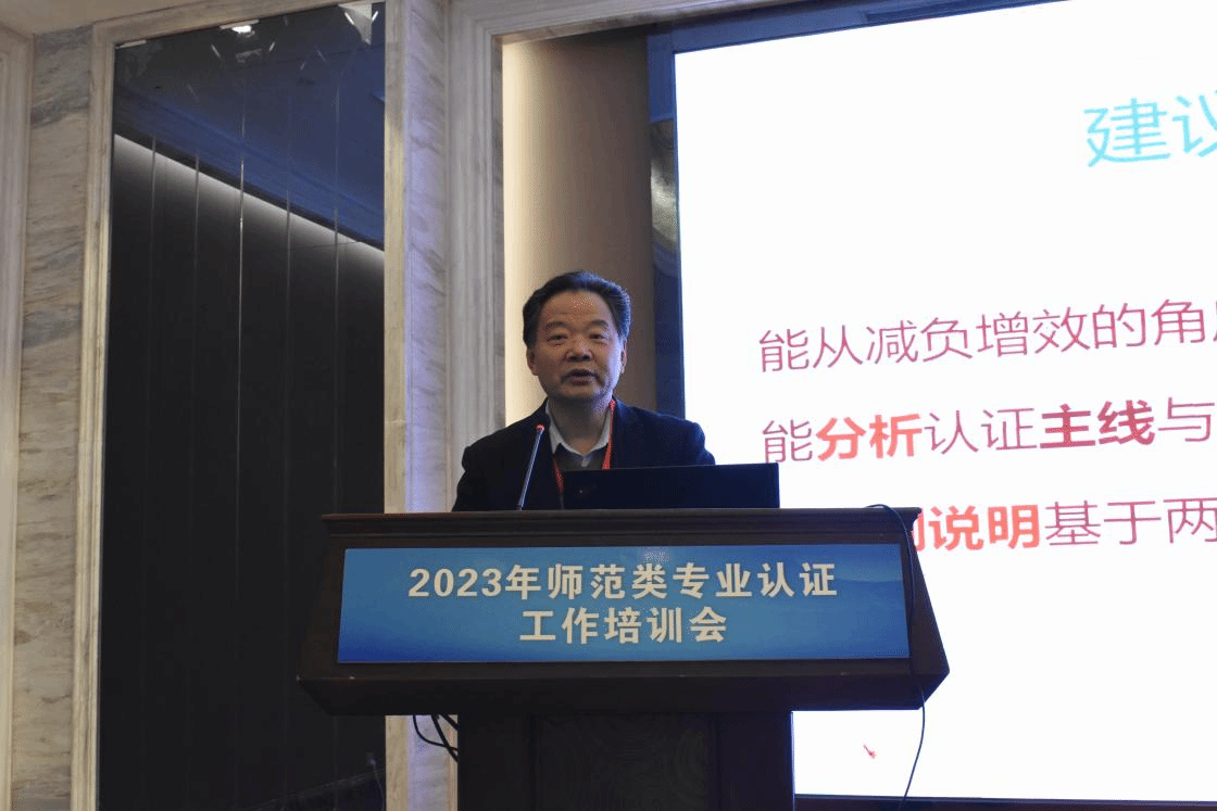 培训会安排了五场专题报告,教育部师范类专业认证专家委员会委员、beat365唯一官方网站宋冬生教授以“聚焦两线问题,突出重点举证”为题,从减负增效的角度剖析了认证新文件新在何处,对认证主线与底线逻辑的5个操作性要点进行了分析,举例说明了“需求调研报告”“专业教育实践表现性考核标准”等基于两线的7个重中之重的举证要求与要领。