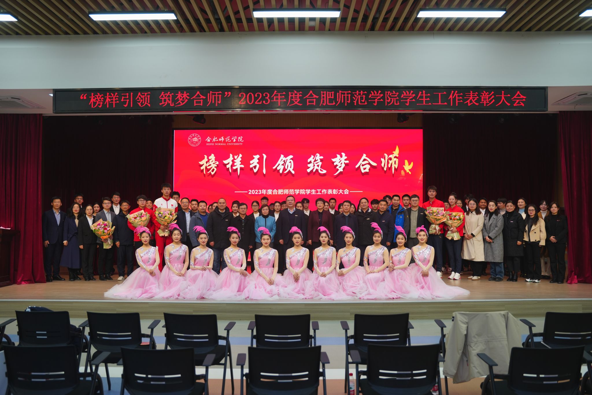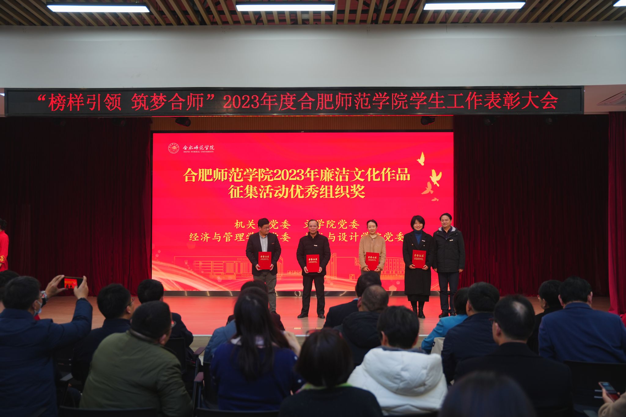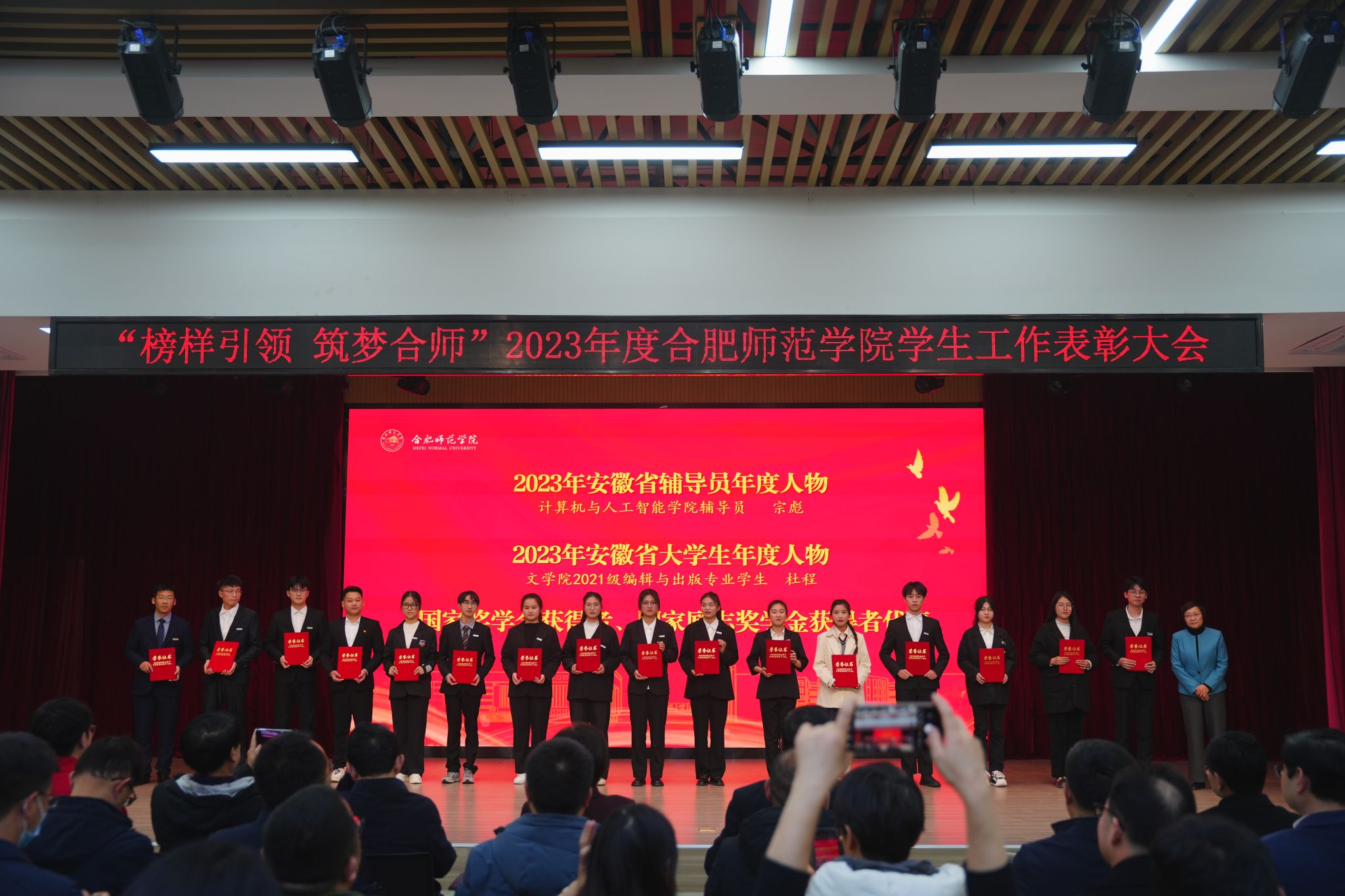 12月28日下午,学院在锦绣校区大学生活动中心举行“榜样引领 筑梦合师”2023年度学生工作表彰大会。院党委书记徐成钢,院党委副书记、院长方东玲,院党委副书记梁立昌,院纪委书记、监察专员徐文林,院党委委员、组织部部长赵帮恚,院党委委员、宣传部、统战部部长常树宝出席大会,有关部门负责人,各二级学院党委书记、副书记,全体辅导员,学生代表参加大会。