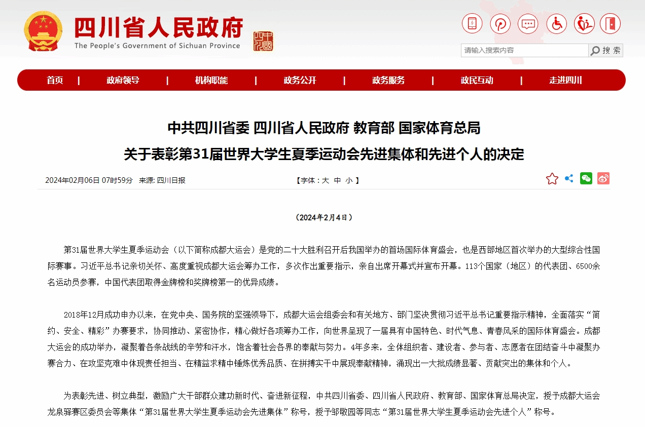 为表彰先进、树立典型,激励广大干部群众奋进新征程、建功新时代。2月4日,中共四川省委、四川省人民政府、教育部、国家体育总局联合印发《关于表彰第31届世界大学生夏季运动会先进集体和先进个人的决定》,beat365体育科学学院荣获“第31届世界大学生夏季运动会先进集体”,2021级体能训练专业胡凯被授予“第31届世界大学生夏季运动会先进个人”称号。