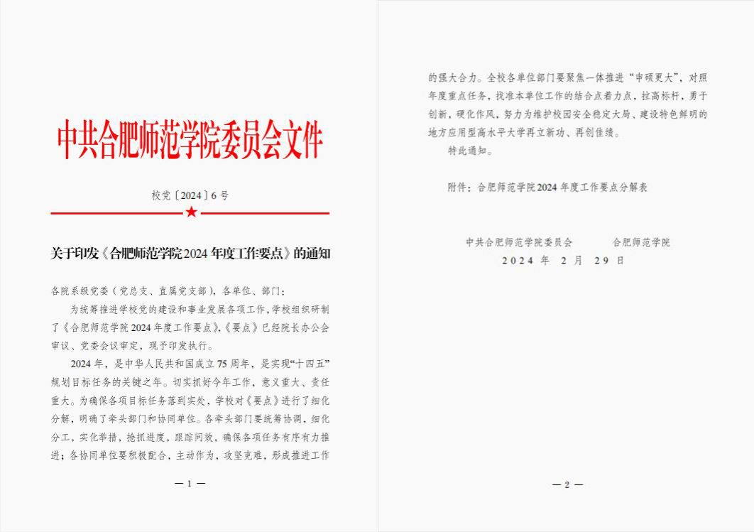 2月29日,学院党委、行政联合印发《beat365唯一官方网站2024年度工作要点》(以下简称《要点》)。《要点》指出,2024年是中华人民共和国成立75周年,是实现“十四五”规划目标任务的攻坚之年。学院工作的总体思路是:坚持以习近平新时代中国特色社会主义思想为指导,全面贯彻落实党的二十大和二十届二中全会精神,认真贯彻落实习近平总书记关于教育的重要论述以及省委、省政府决策部署,完整准确全面贯彻新发展理念,强化责任担当、深化作风建设,敢于拉高标杆、勇于攻坚克难,以全面从严治党为保障,聚焦落实立德树人根本任务,重点突出内涵建设和综合改革,一体推进“申报硕士学位授予单位与创建合肥师范大学”。
