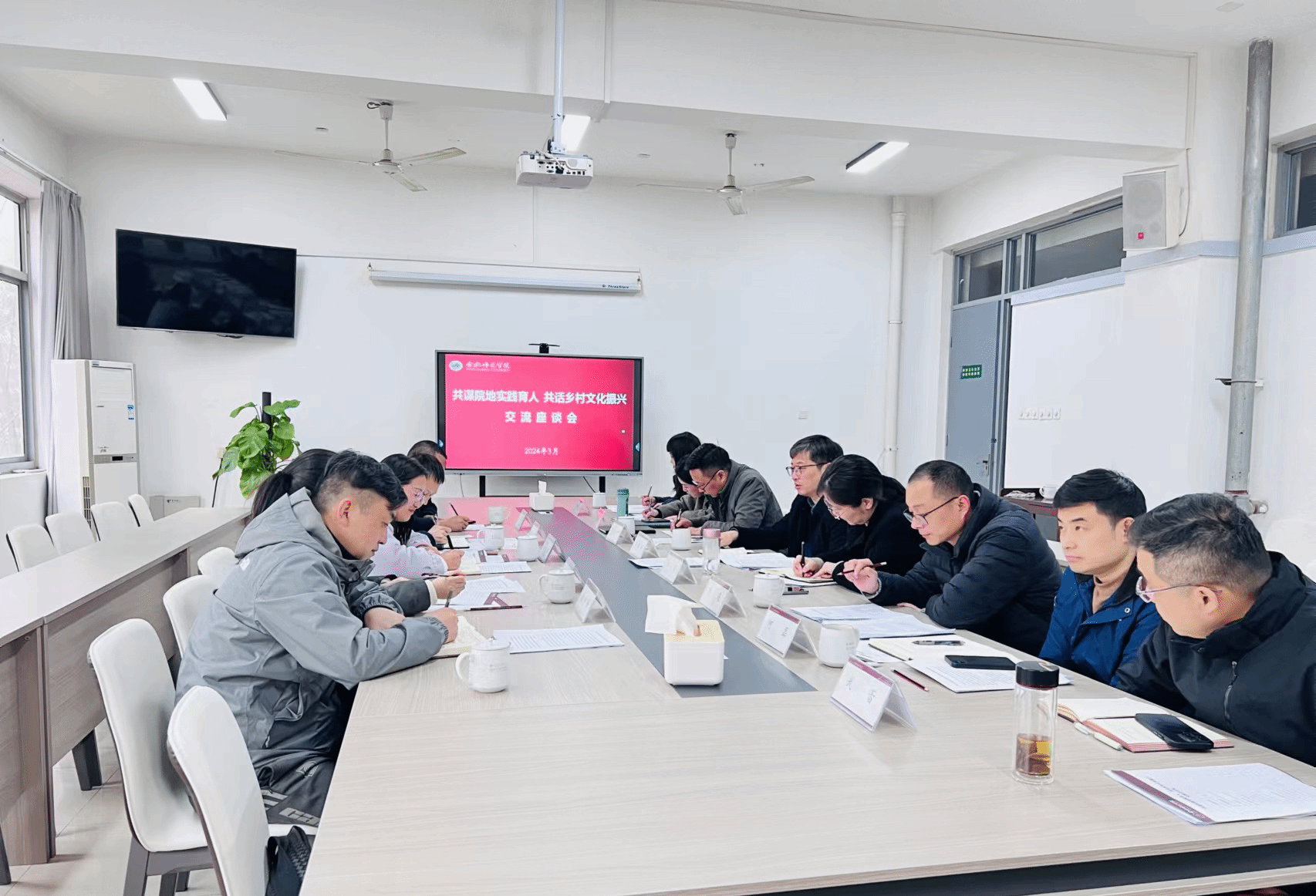 为发挥学院专业优势,推进院地合作实践育人,推动青年助力乡村文化振兴,3月18日下午,美术与设计学院党委与长丰团县委开展“共谋院地实践育人 共话乡村文化振兴”为主题的交流会。长丰团县委书记杜倩倩、副书记孙霄,马郢村第一书记钟宇等一行来院洽谈交流,校党委委员、副校长华银峰出席会议,美术与设计学院党委书记沙渺,副院长吴道义,学院教工党支部书记,分团委书记,教师代表等参加座谈交流。会议由沙渺主持。