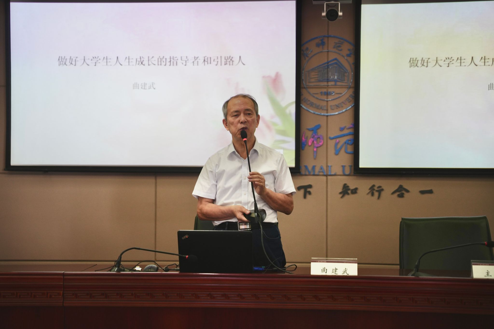 报告会在行知楼2011会议室举办,各二级学院党委副书记及全体辅导员参加了本次报告会,报告会由学生工作部部长刁文彬主持。曲建武以《做好大学生人生成长的指导者和引路人》为题,结合自己四十余年的学生工作经历,从“不忘初心使命”和“倾力铸魂育人”两个方面,讲述了自己教育引导帮扶学生的感人经历。通过一幅幅珍贵照片、一段段感人事迹、一系列名言名句,用亲身经历,通过生动、鲜活、催人泪下的事例为大家讲述了如何做好一名爱岗敬业、爱生如子的辅导员的心路历程,生动诠释了辅导员工作的重要使命与责任担当,诠释了一名思想政治工作者的为党育人、为国育才的初心使命。他勉励广大辅导员,要自觉把自身工作与党和国家的伟大事业联系起来,坚定理想信念,积极担当作为,始终牢记自己的使命和责任,把思想政治教育工作当成一生为之奋斗的崇高事业,在服务学生中实现人生价值。