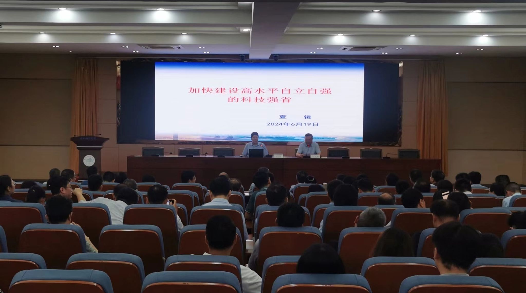 为深入学习贯彻习近平总书记关于科技创新的重要论述,巩固拓展主题教育成果,提高干部队伍的履职能力,6月19日晚,学院在锦绣校区学术报告厅举办第三期“干部行知夜校”,安徽省科学技术厅原副厅长、省外国专家局局长、一级巡视员夏辑应邀作《加快建设高水平自立自强的科技强省》报告。院领导班子成员、全体处科级干部、党支部书记、党务秘书近300人参加,院党委书记徐成钢主持会议。