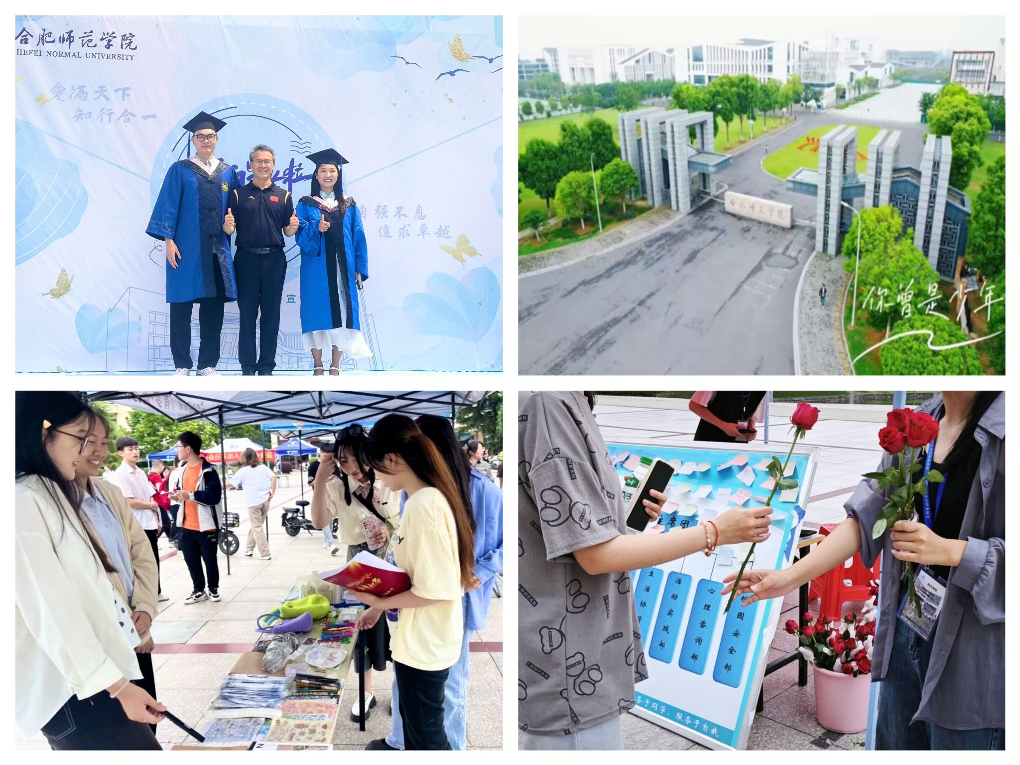 学生工作处、院团委在校园内布置毕业季横幅,在行知广场、生活广场摆放毕业季桁架,让同学们在“在合师启航青春,为梦想砥砺前行!”标语下拍照打卡留念。院团委策划推出“2023毕业季”新媒体专题栏目,图文结合为毕业生们送上美好祝愿;摄制毕业季主题MV《你曾是少年(合师版)》,收获师生好评。院学生会开展“我的旧物不毕业”跳蚤市场活动,让毕业生们在跳蚤市场上摆出了衣物、书籍等各式各样的二手物品。大学生自律委员会举办“毕业心语,玫瑰寄情”活动,传递学弟学妹们对毕业生们的祝福与鼓励。一系列活动营造了和谐温馨的毕业氛围,丰富了毕业生离校前的美好难忘时光。