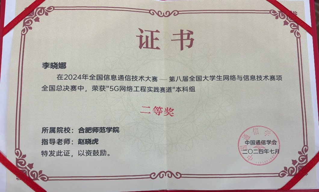 在教务处支持下,电子信息与集成电路学院安排竞赛指导教师,对参赛队伍进行赛事全过程培训指导。最终,由赵晓虎老师指导的2023级通信工程2班李晓娜同学在以安徽、江苏、浙江、上海等7个省、直辖市的100余所高校组成的区域赛中荣获5G网络工程实践赛道(本科组)一等奖晋级全国总决赛,并在全国总决赛中经过激烈角逐和严格评审,荣获全国总决赛二等奖。
