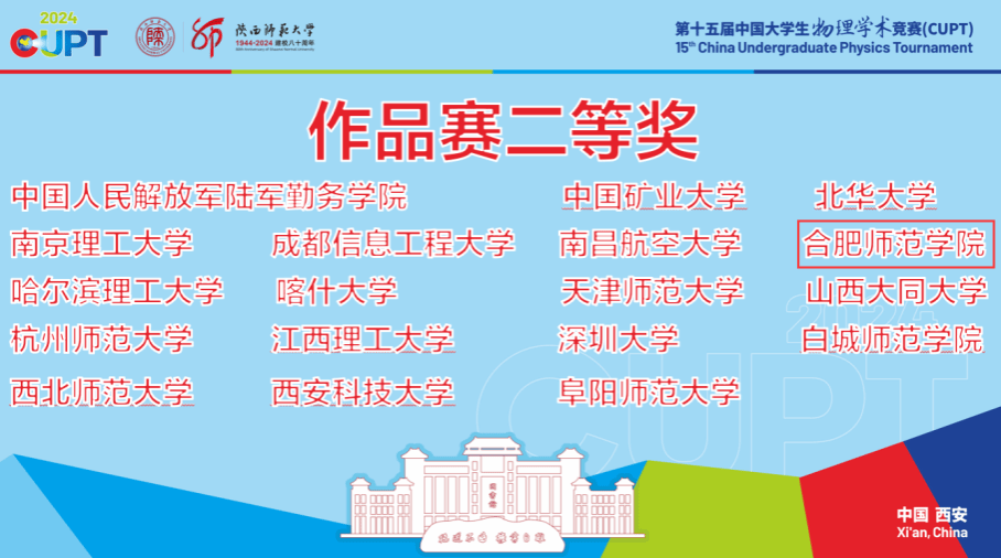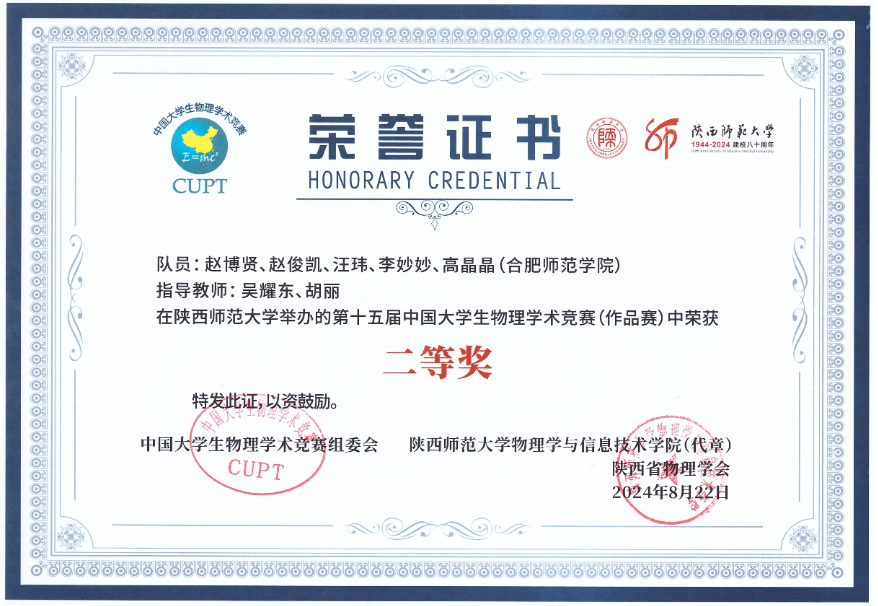 8月18日至23日,由中国大学生物理学术竞赛组委会主办,陕西师范大学和陕西省物理学会承办的第十五届中国大学生物理学术竞赛(简称CUPT)在陕西西安举行,本赛事共吸引了来自全国近百所高校的800余名师生参赛。由物理与材料工程学院吴耀东、胡丽老师指导,赵博贤、赵俊凯、汪玮、李妙妙、高晶晶五人组成的参赛团队经过激烈角逐,代表beat365唯一官方网站的参赛作品《吸管水泵的理论与实验分析》终斩获第十五届中国大学生物理学术竞赛(作品赛)二等奖,充分展现了beat365唯一官方网站学子敢于拼搏,积极向上的实力与风貌。
