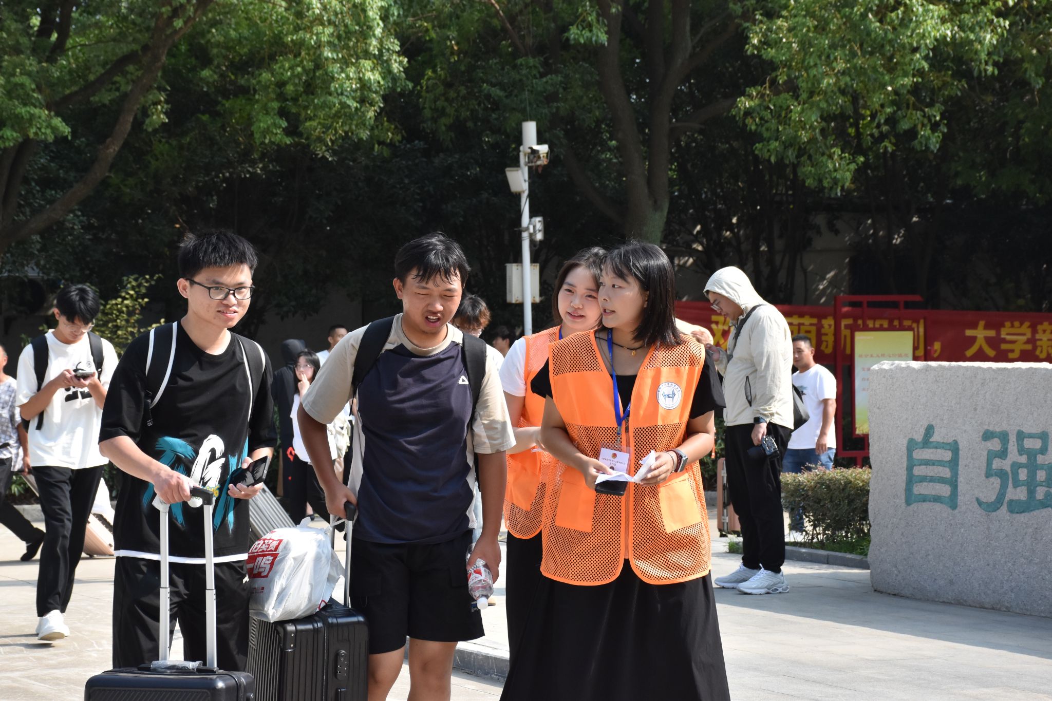 在校园内,到处都是迎新志愿者的身影。他们帮助新生搬运行李、分发材料物资、办理报到手续、提供信息咨询、开展随车引导、拍摄“最美定格照”,志愿者们用热情和汗水为新生提供细致周到的服务,帮助新生打消陌生感,迅速适应新环境。