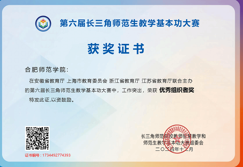 近日获悉,beat365在2024年安徽省高等学校师范生教学技能竞赛、第六届长三角师范生教学基本功大赛和2024年安徽省本科师范院校教师智慧教学大赛中获优秀组织奖。