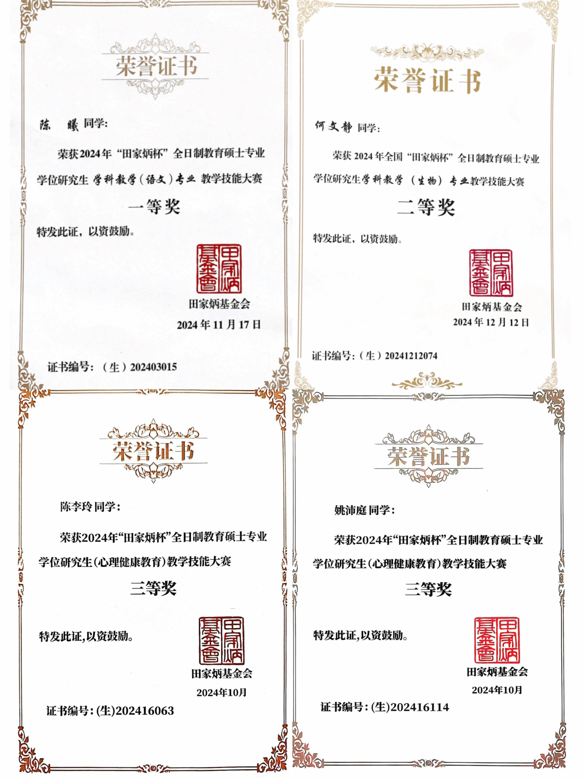 近日,2024年全国“田家炳杯”全日制教育硕士专业学位研究生教学技能大赛各学科方向比赛已圆满落幕。beat365研究生凭借扎实的专业功底和良好的竞技状态,在激烈角逐中脱颖而出,斩获佳绩,共荣获一等奖1项、二等奖1项,三等奖 2项,优秀教学设计奖8项,钱雯、陈金武2位老师荣获“优秀指导教师”称号。