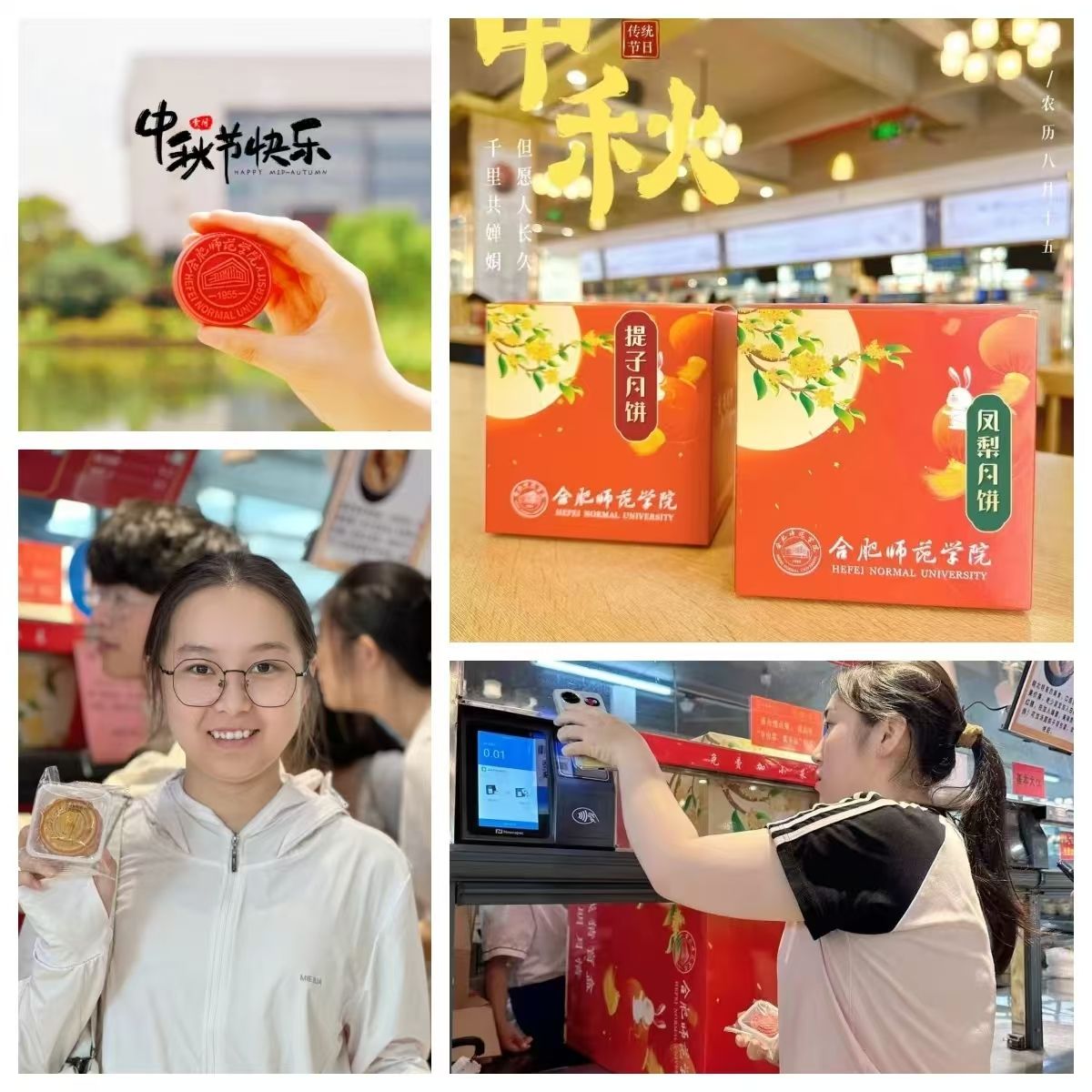 在中秋佳节,学院匠心独运地推出 “月饼送祝福,情谊满合师” 主题活动,特别定制带有合师专属 logo 的月饼。活动期间,师生只需前往食堂指定窗口支付 “一分钱”,便可参与抽取盲盒月饼。盲盒月饼内含八种不同口味,为师生们带来了满满的惊喜。一枚枚印着校徽图案的月饼,不仅是美味的食品,更承载着深厚的合师情。现场洋溢着浓浓的节日氛围,满满的仪式感让同学们纷纷举起手机,记录并分享这些美好的瞬间。