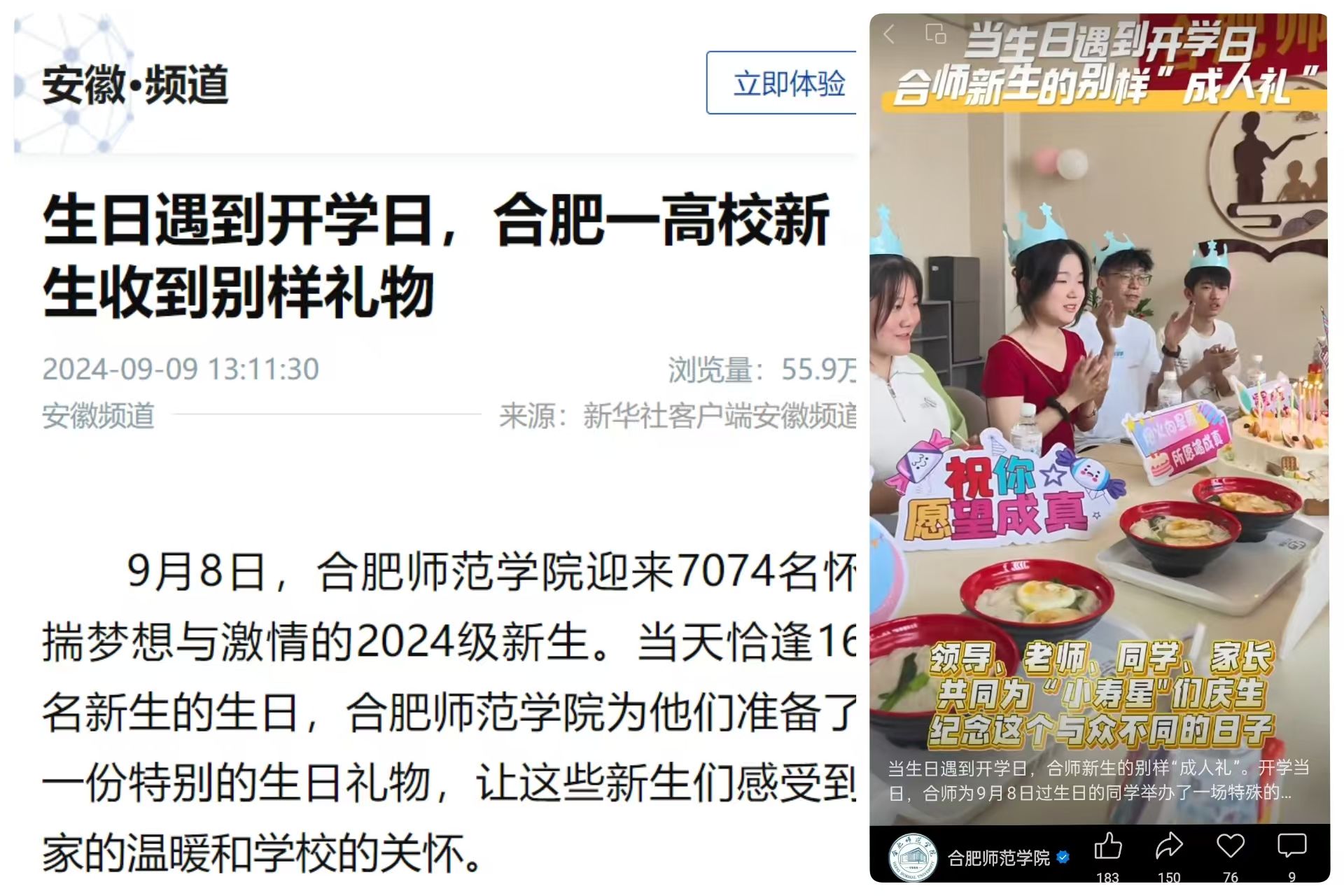 2024级新生报到日当天,恰逢 16 名新生生日。学校为此精心筹备了一场温馨的 “新生生日会”,现场为学生们分蛋糕、齐唱生日歌,并一起合影留念。新华社客户端以《生日遇到开学日,合肥一高校新生收到别样礼物》为题,对beat365 “新生生日会” 活动进行了专题报道,该报道单日浏览量高达55万余次,引发了广泛关注。这是对“暖心合师”生动诠释。
