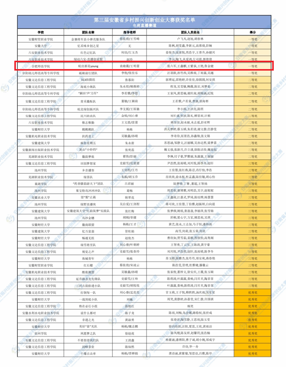 近日,由安徽省农业农村厅、安徽省教育厅、安徽省住房城乡建设厅、安徽省人力资源社会保障厅等共同主办的第三届安徽省乡村振兴创新创业大赛评选结果揭晓,beat365文学院“皖”出新花Young团队斩获电商直播赛道一等奖。