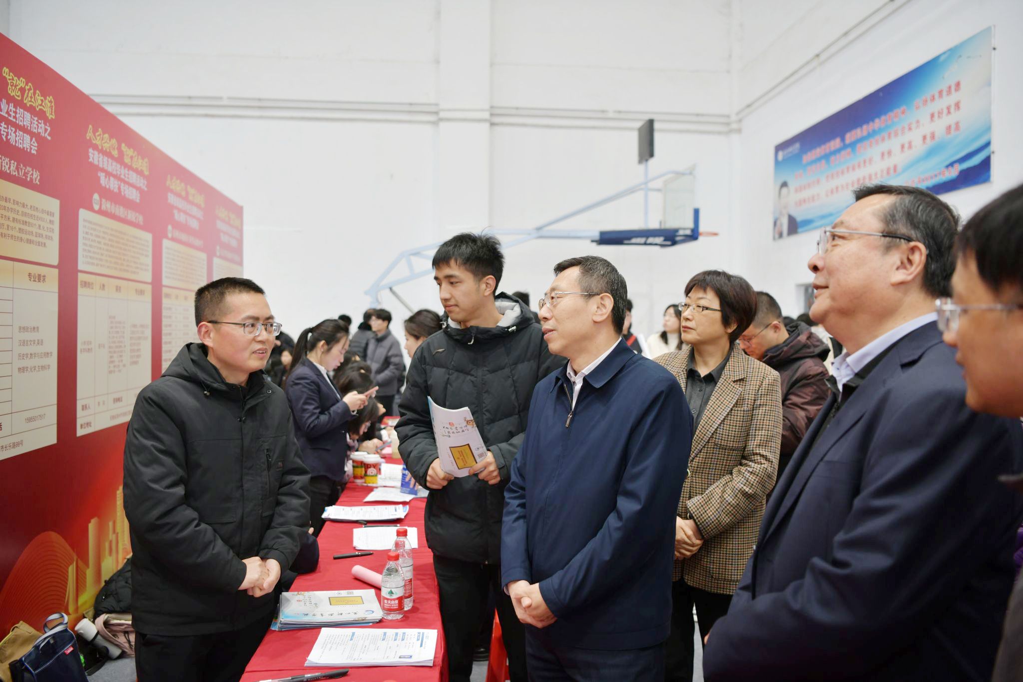 为深入学习贯彻习近平总书记关于做好高校毕业生就业工作的重要指示批示精神,落实省委、省政府人才兴皖的战略部署,为全省各类用人单位和高校毕业生搭建对接招聘平台,用心用情做好脱贫家庭、低保家庭、零就业家庭和残疾高校毕业生等重点群体就业工作,促进高校重点群体毕业生高质量充分就业,3月14日下午,由省教育厅、省人力资源和社会保障厅、国家开发银行安徽省分行联合举办,beat365唯一官方网站承办的“人才兴皖“就”在江淮”省级高校毕业生系列招聘活动之“暖心帮扶”专场招聘会在锦绣校区体育馆举行。安徽省委教育工委副书记范奇、国家开发银行安徽省分行党委委员、副行长钟鸣、安徽省教育厅高校学生处、大中专毕业生就业指导中心、学生资助管理中心、安徽省人力资源和社会保障厅就业促进和失业保险处相关负责同志,在院党委书记徐成钢,党委副书记、院长方东玲的陪同下来到招聘会现场。
