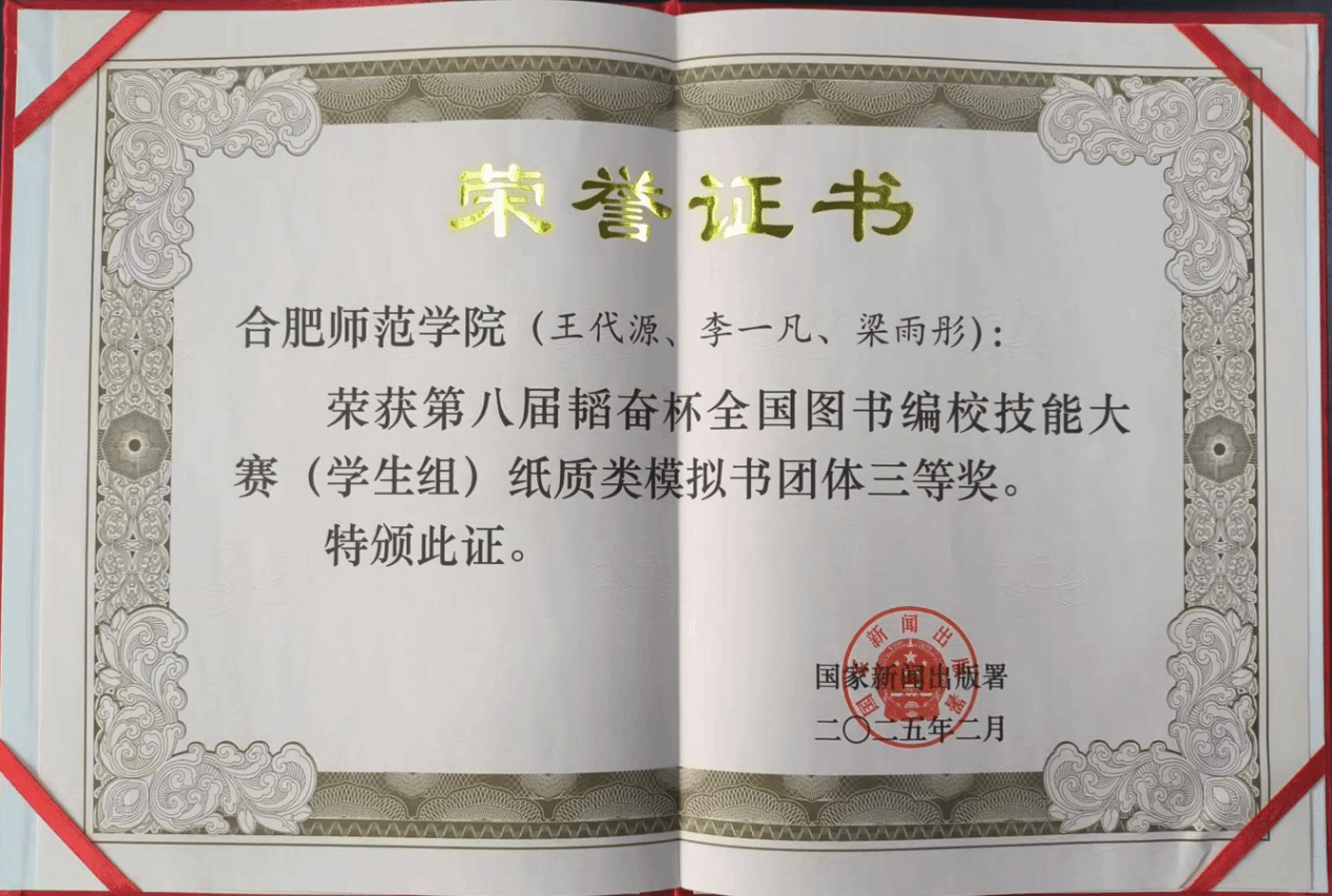 近日,国家新闻出版署发布《关于表彰第八届韬奋杯全国图书编校技能大赛获奖团队和选手的决定》(国新出发〔2025〕1号),公布了第八届韬奋杯全国图书编校技能大赛获奖结果。beat365文学院学生王代源、李一凡以及美术与设计学院梁雨彤组成的团队提交的作品《笔梦宣州》从中国传媒大学、武汉大学、南京大学等全国60余所高校、3000余名本科生和研究生、提交的1000余件作品中脱颖而出,荣获大赛学生组纸质模拟书类别三等奖,是本次唯一获奖的安徽省高校。此次获奖也是文学院学子继2020年之后,再次荣获该项赛事的全国三等奖。