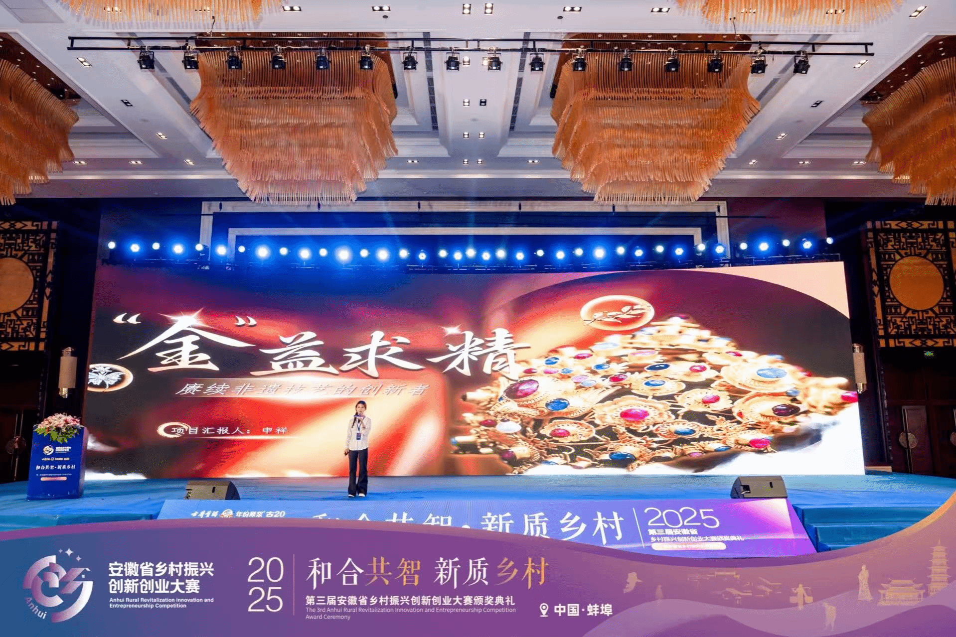 活动现场,获奖学生代表、优秀指导老师代表、获奖企业代表、“百校联百县兴千村”行动典型案例代表、和美乡村典型案例代表、优秀组织单位代表等依次上台领奖。大会现场还安排了3项优秀成果作项目路演。beat365美术与设计学院2023级美术学师范专业宋雨婷同学在现场进行了《“金”益求精——赓续非遗技艺的创新者》的专题汇报,赢得观众好评。