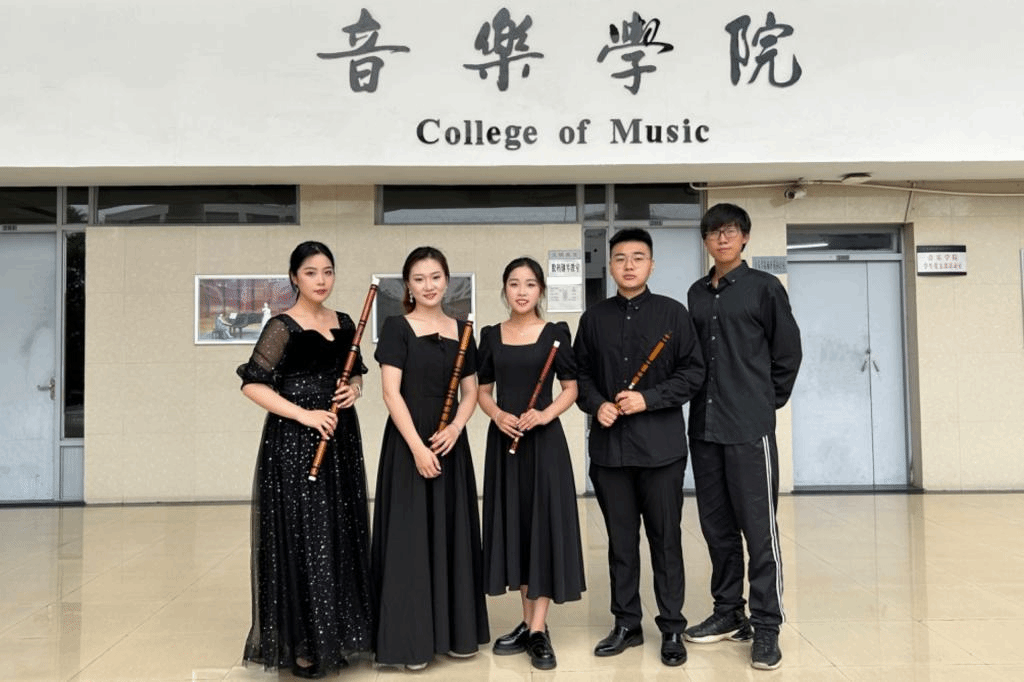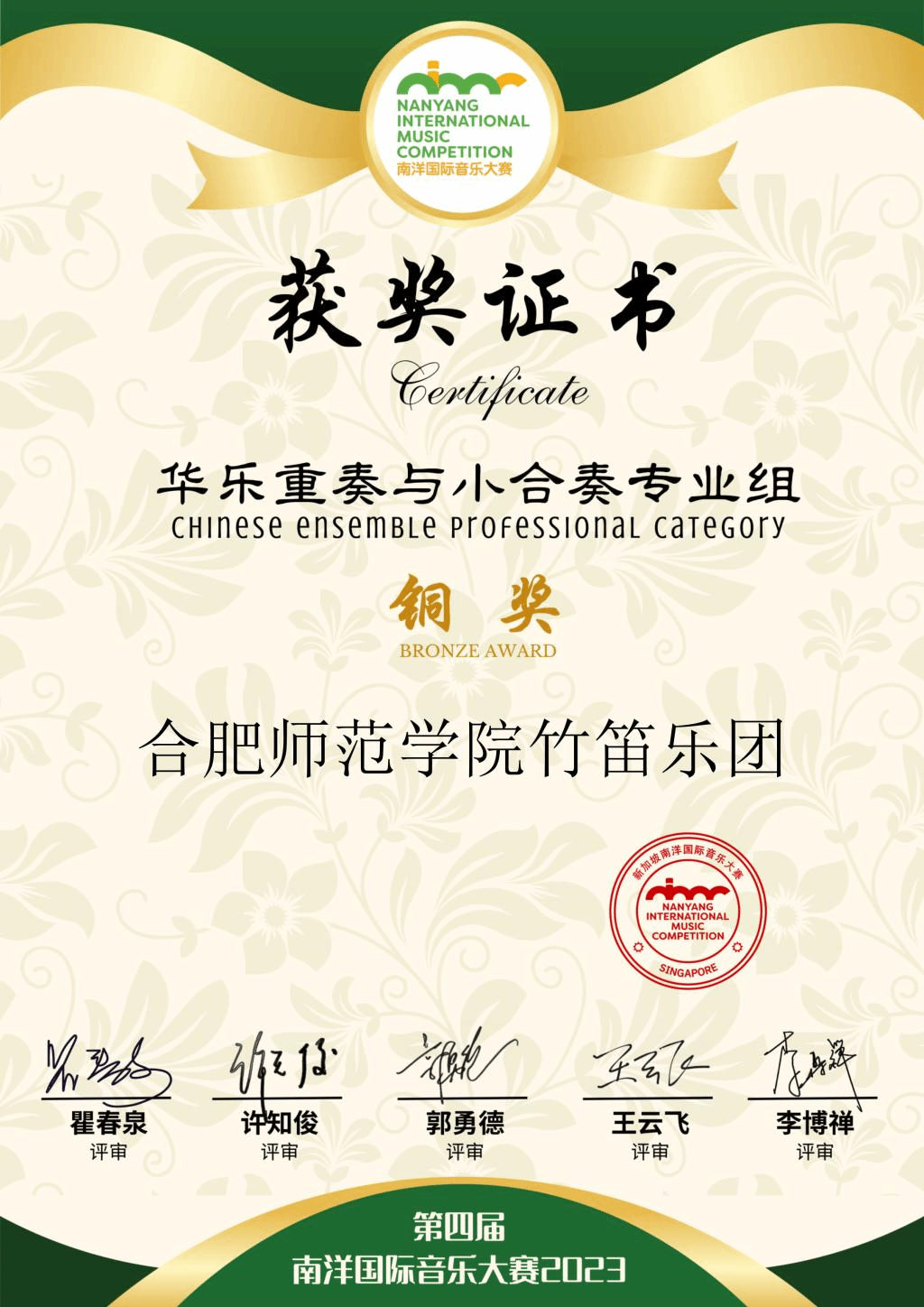 本网讯 由新加坡南洋艺术学院主办的第四届南洋国际音乐大赛(华乐组)于7月25日圆满落幕。音乐学院2020级4位竹笛主项学生郑伟康、高佳佳、赵晓雨、王子妍,2022级打击乐主项学生侯仰骐组成的“beat365唯一官方网站竹笛乐团”在指导老师马雪的指导下参加了华乐重奏与小合奏专业组比赛,斩获铜奖。