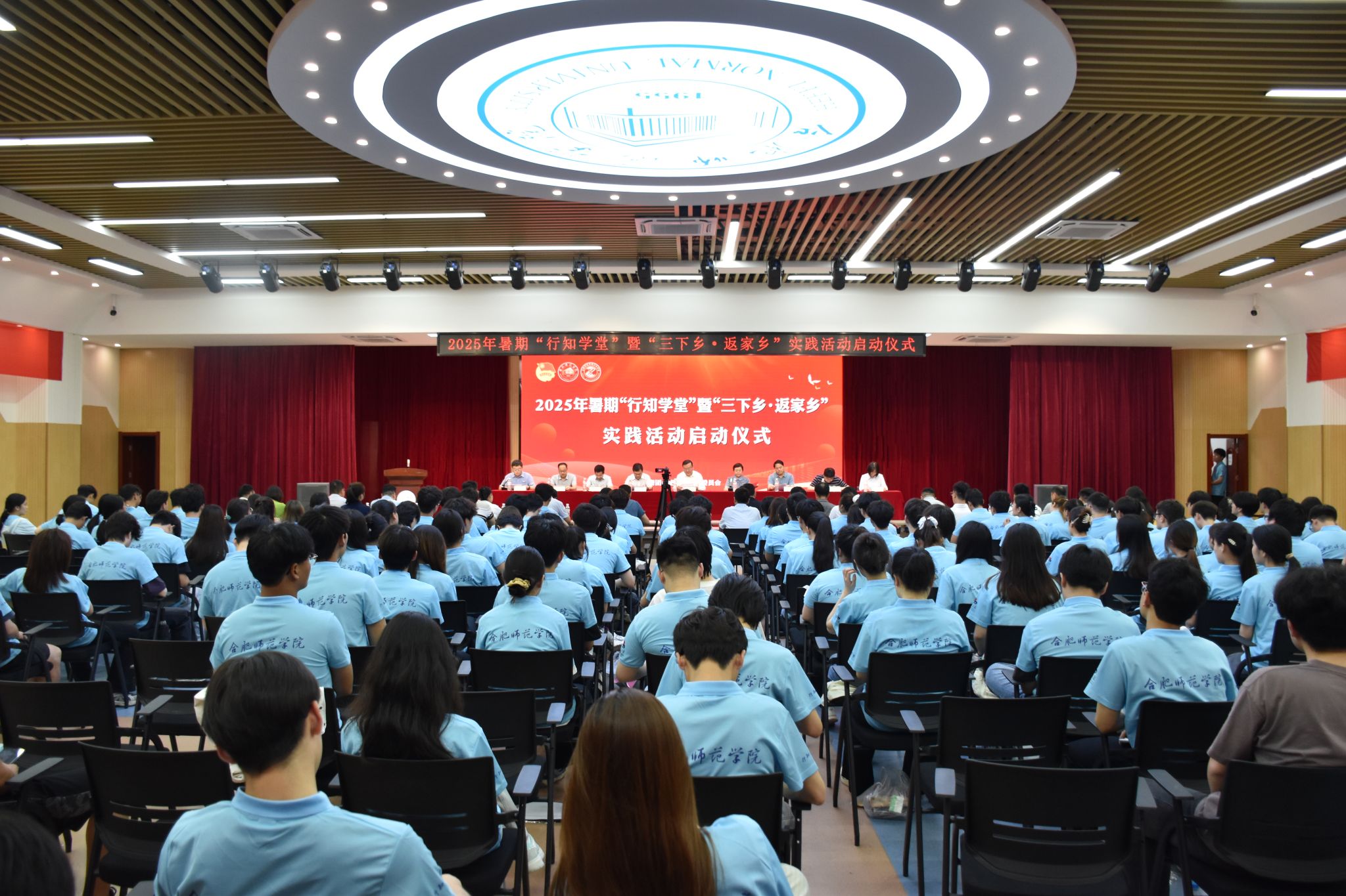 6月20日中午,学院在锦绣校区大学生活动中心举行2025年暑期“行知学堂”暨“三下乡·返家乡”实践活动启动仪式。院党委书记徐成钢、院党委副书记梁立昌,党委委员、组织部部长赵帮恚,党委委员、宣传部部长、统战部部长常树宝,党政办公室、教务处、学生工作处、团委、马克思主义学院等单位负责人,各二级学院党委(党总支)书记、团委书记、辅导员,行知学堂“小先生”代表300余人参加启动仪式。