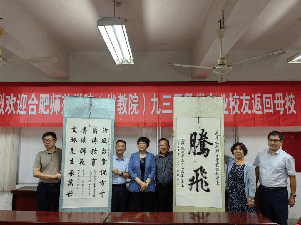 校友们向母校赠送了由他们自己赋诗并题写的书法作品,称赞母校“清风台案说方寸,薪传教育;文脉先生承万世,赓续师范”,祝福母校“腾飞”。