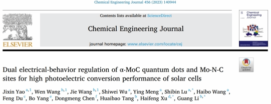 本网讯 近期,我院电子信息与集成电路学院在能源器件方向取得新进展,相关研究成果以“Dual electrical-behavior regulation of α-MoC quantum dots and Mo-N-C sites for high photoelectric conversion performance of solar cells”为题发表在国际著名期刊《Chemical Engineering Journal》上。beat365唯一官方网站为第一完成单位,学院姚吉鑫博士为第一作者。《Chemical Engineering Journal》期刊影响因子指数16.744,涵盖了工程技术、化工全领域的基础和跨学科领域的应用研究,收录了领域内最前沿的优秀论文。