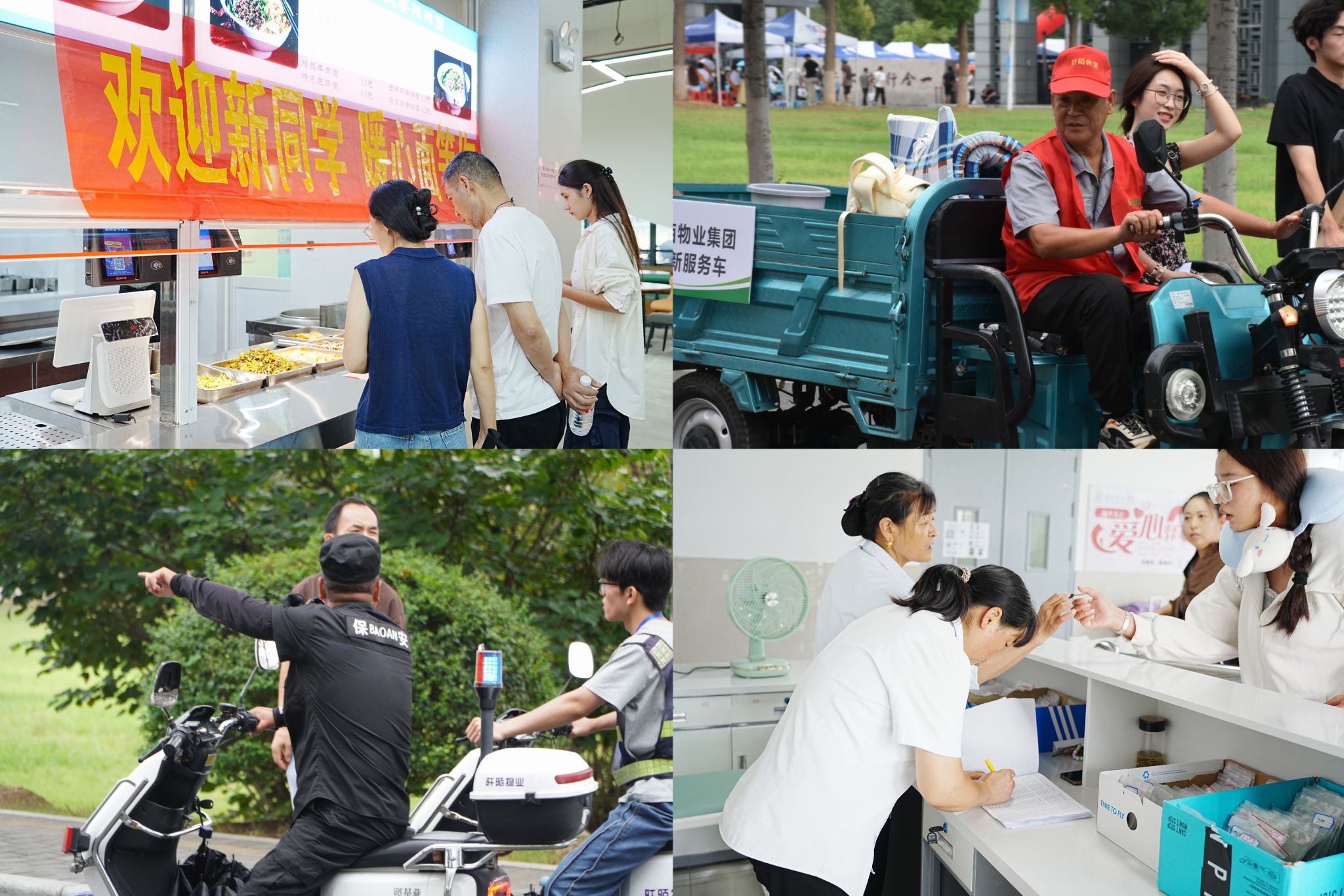 在“绿色通道”服务站,家庭经济困难同学在工作人员的帮助下,一站式办理助学贷款、政策咨询等业务;在各迎新展台,相关职能部门为新生提供教学、生活、缴费等方方面面的咨询与保障服务;在校门、路口、迎新区的每一个角落,物业人员巡回打扫、微笑服务,保卫人员疏导交通、巡逻值守;学院还安排人员提前检修和更新基础设施,协调校园商业环境,联合警方开展反诈骗宣传等,全方位的保障措施共同营造了安全、便捷、温馨的入学环境。