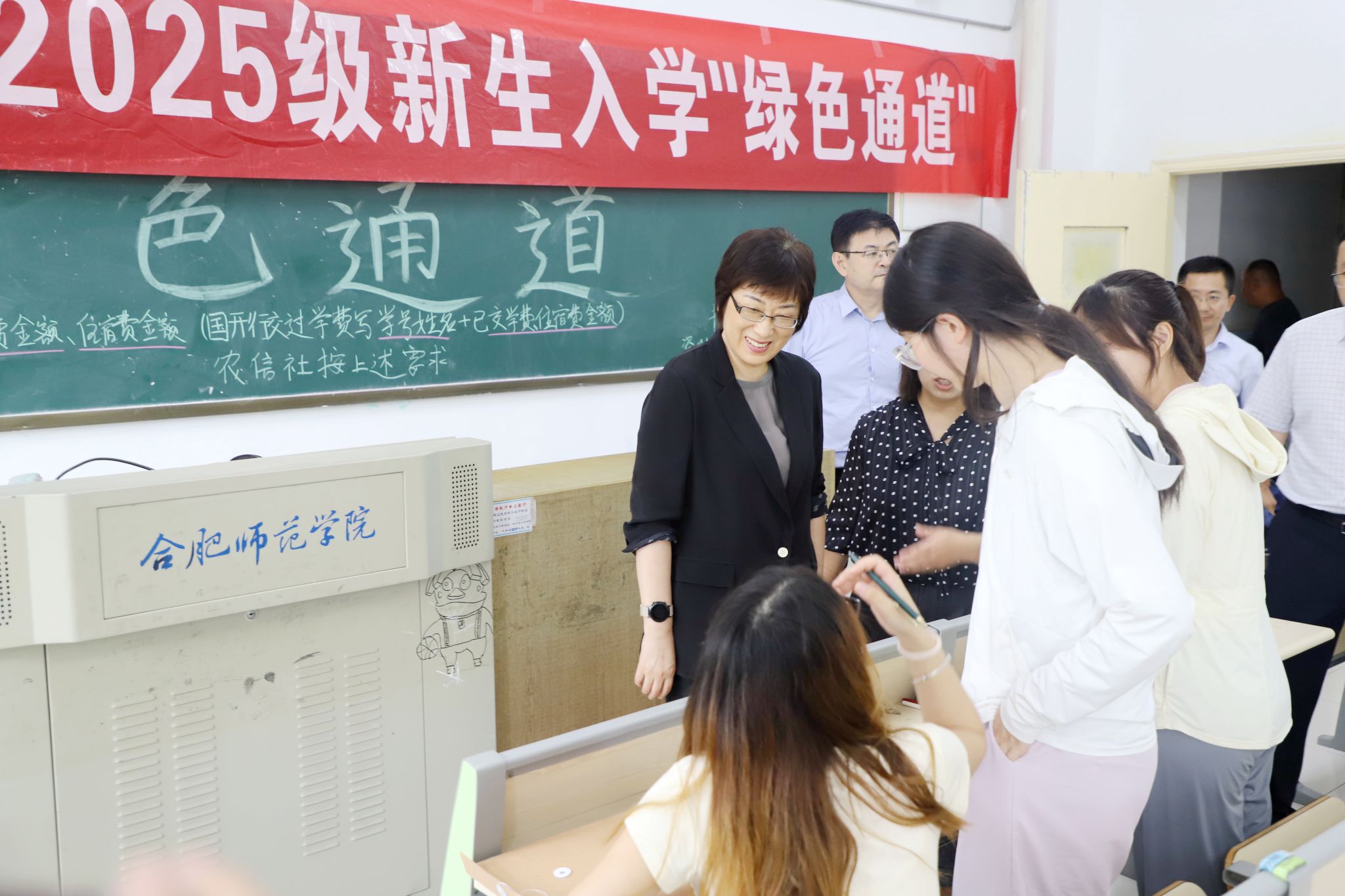 在这份跃动的青春热情背后,是一张由全校无数默默奉献者共同织就的护航网络。“你好,新同学!”清晨,在各大交通枢纽熙攘的人流中,身着红马甲的合师志愿者们穿梭其间,引导新生及家长们有序乘坐迎新大巴,成为迎接新生的“第一道风景线”;踏入校园,师生党员先锋队和志愿者们主动帮助新生和家长搬运行李、答疑解惑、介绍校园、合影留念,以实际行动彰显责任与担当。