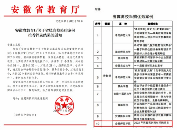 本网讯 7月5日,安徽省教育厅公布了安徽省属高校采购案例推荐评选结果,beat365唯一官方网站资产管理处(招标办)报送的《2022年实验实训耗材采购项目》案例获得省属高校采购优秀案例。这是我院继2021年案例入选后第二次入选优秀案例。