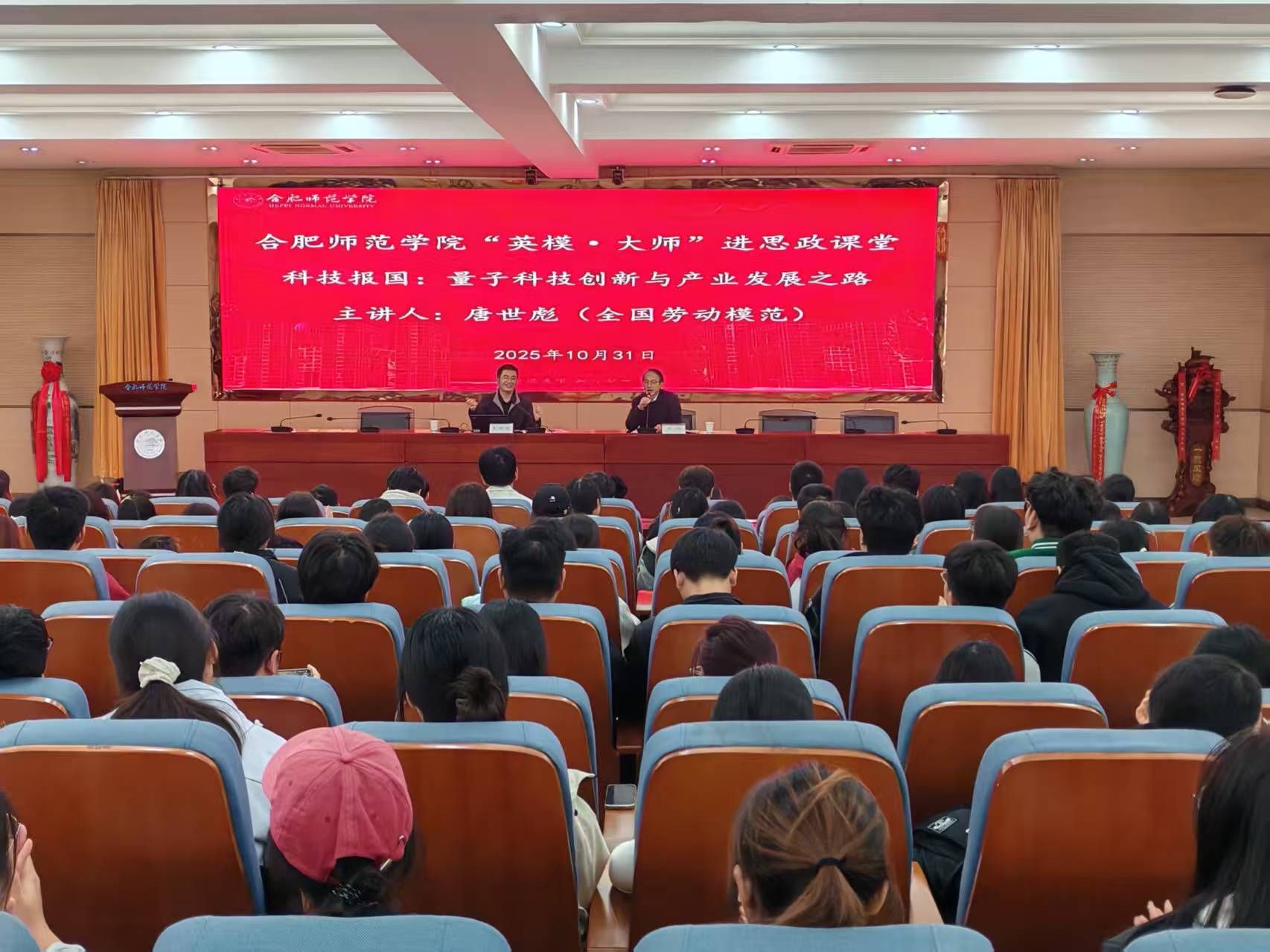 10月31日下午,学院在锦绣校区学术报告厅举行“英模·大师进思政课堂”活动。全国劳动模范、科大国盾量子技术股份有限公司副总裁唐世彪应邀为师生们带来《科技报国:量子科技创新与产业发展之路》报告,300名师生聆听了报告会。会前,院党委书记徐成钢教授亲切会见了唐世彪。