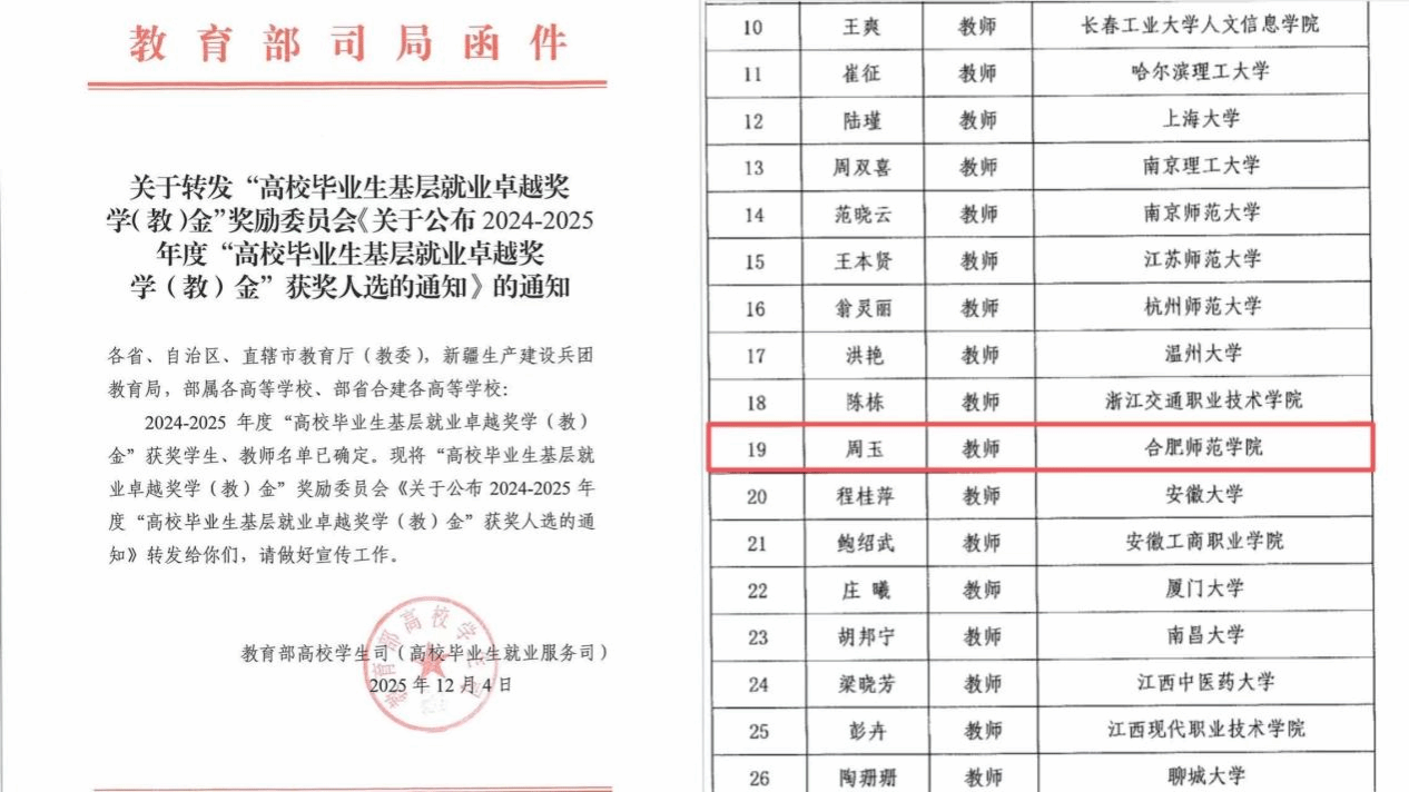 此次获奖是对周玉深耕基层就业指导工作的高度肯定,更是学校落实立德树人根本任务、扎实推进就业育人工作的重要成果。未来,学校将充分发挥先进典型示范引领作用,持续强化就业指导服务,鼓励更多学子扎根基层、绽放青春。(就业创业工作处、电子信息与集成电路学院)