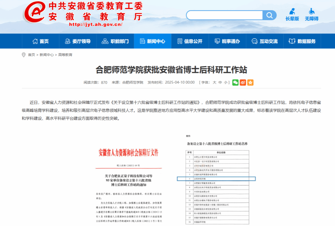 安徽教育网报道《学校成功获批省级博士后科研工作站》