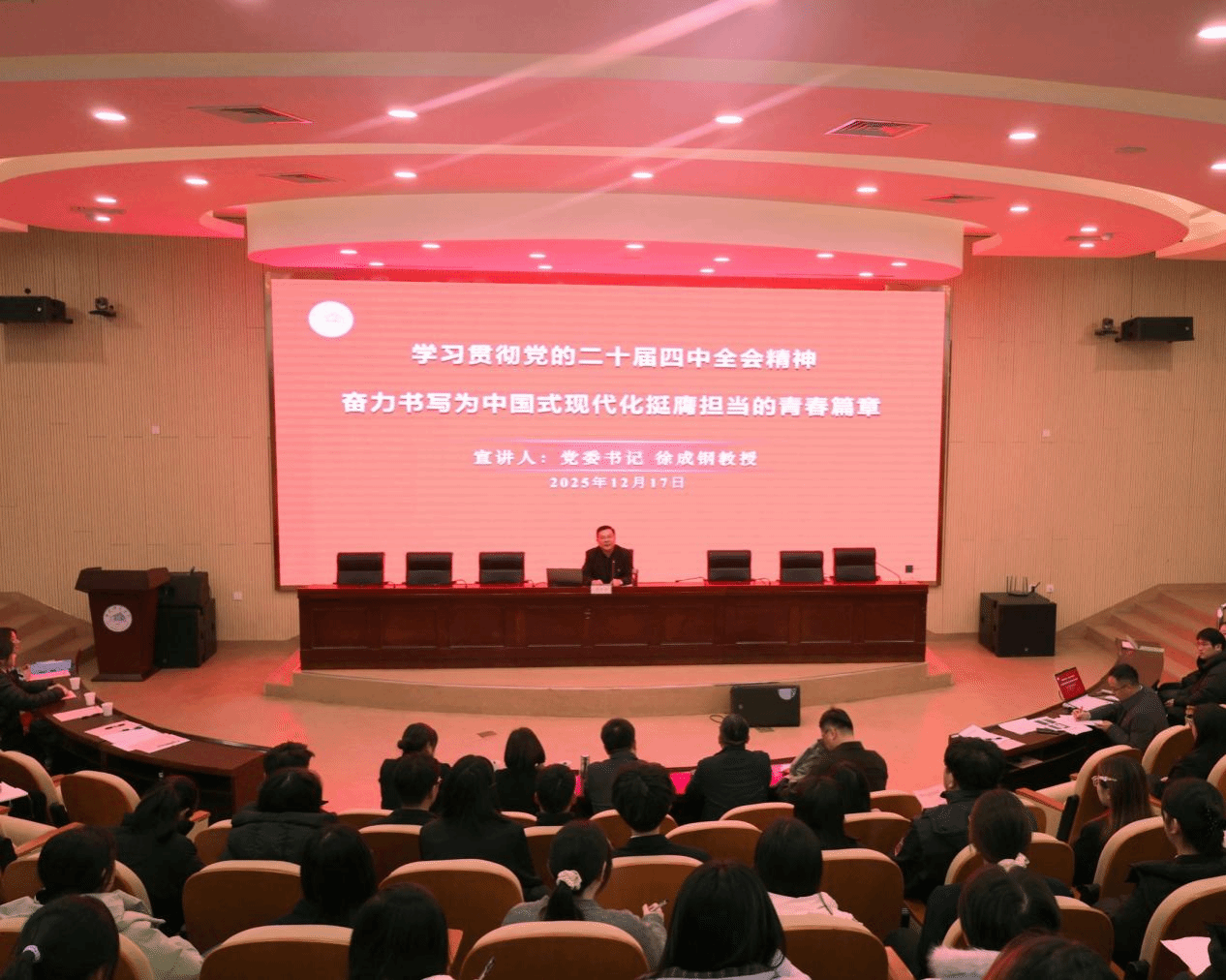 校党委书记徐成钢为青年学生作党的二十届四中全会精神专题宣讲,推动青年学生切实将思想和行动统一到习近平总书记重要讲话精神和党的二十届四中全会精神上来。
