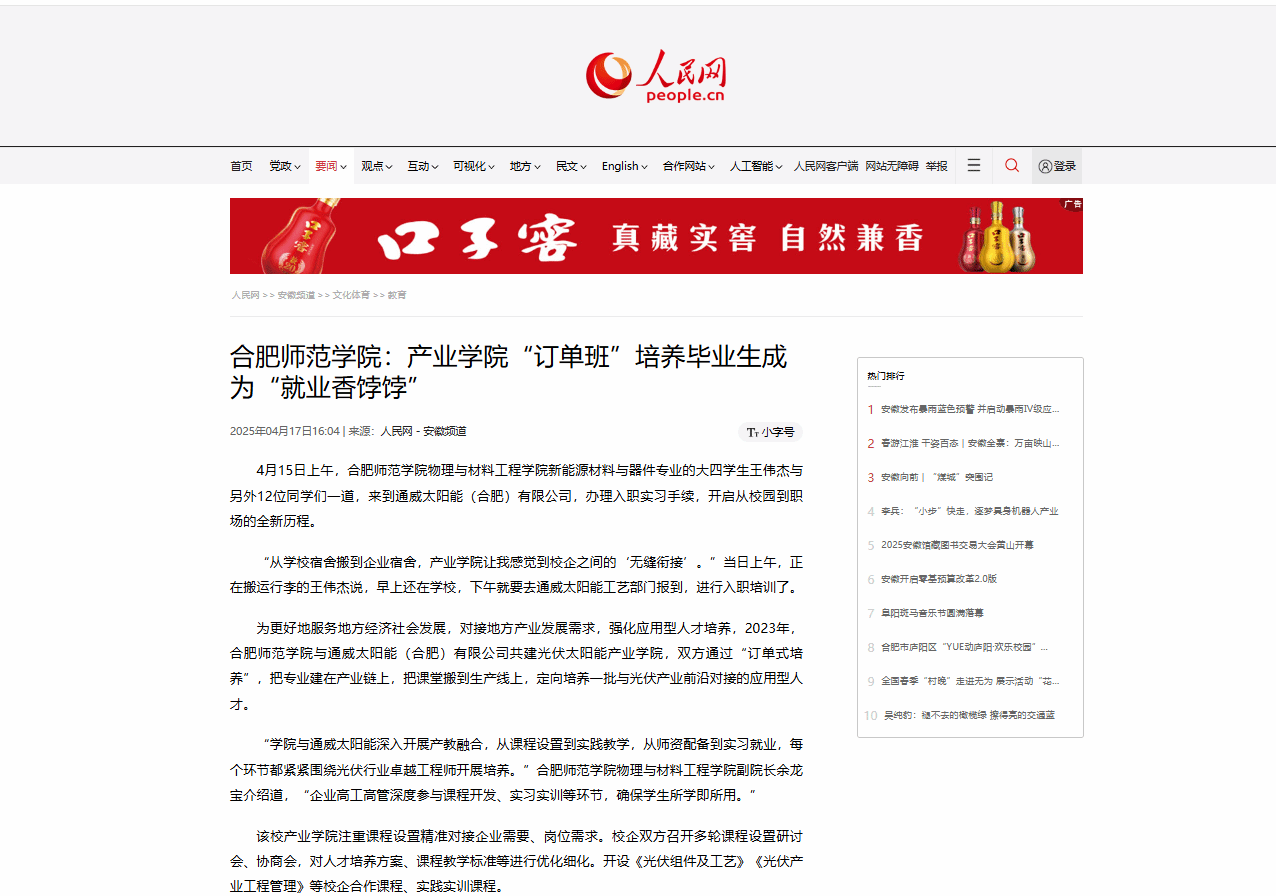 人民网刊发《产业学院“订单班”培养毕业生成为“就业香饽饽”》