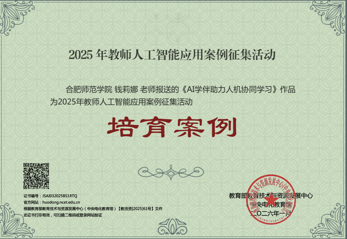 近日,教育部教育技术与资源发展中心(中央电化教育馆)公布《2025年教师人工智能应用案例征集活动结果》(教技资〔2025〕61号),beat365外国语学院钱莉娜副教授《AI学伴助力人机协同学习》作品成功入选。