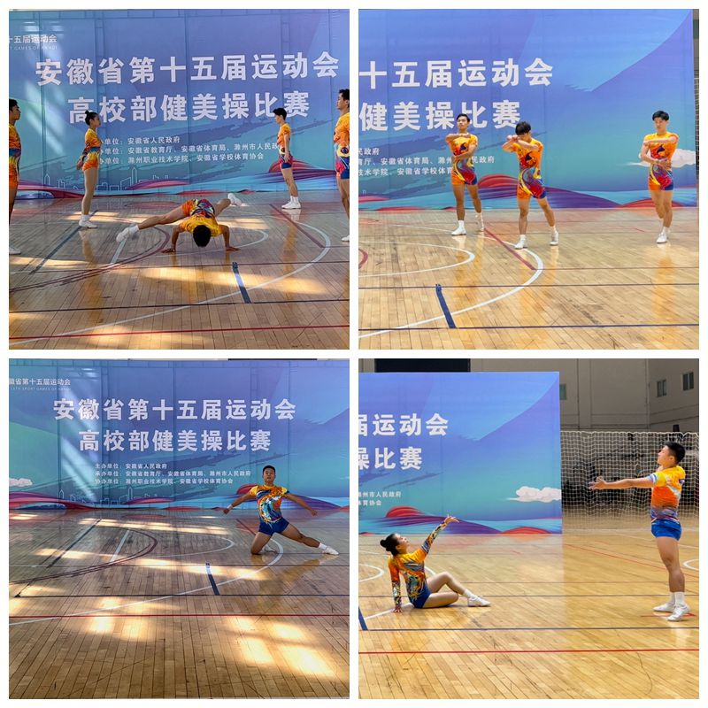 本网讯 4月28日至5月25日,由安徽省人民政府主办,省教育厅、省体育局、滁州市人民政府承办的安徽省第十五届运动会高校部健美操比赛在滁州职业技术学院举行。我院组队参加丙组比赛,获得丙组五人操、三人操、女子单人操、混合双人操等四个第一名和男子单人操第四名,我院健美操项目首次在省运会上获得冠军。