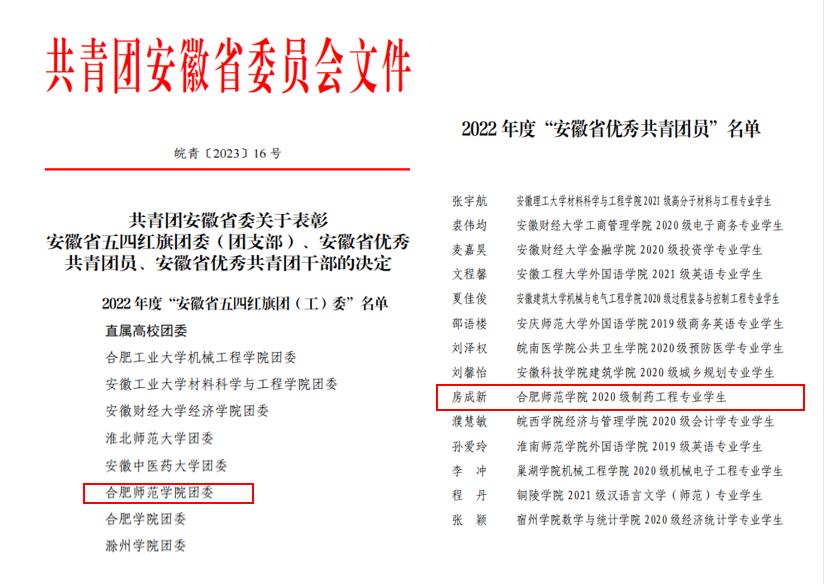 本网讯 近日,共青团安徽省委员会印发《关于表彰安徽省五四红旗团委(团支部)、安徽省优秀共青团员、安徽省优秀共青团干部的决定》,学院团委首次荣获“安徽省五四红旗团委”荣誉称号,这是共青团安徽省委授予安徽共青团组织的最高荣誉。我院化学与制药工程学院2020级制药工程专业房成新同学荣获2022年度“安徽省优秀共青团员”荣誉称号。