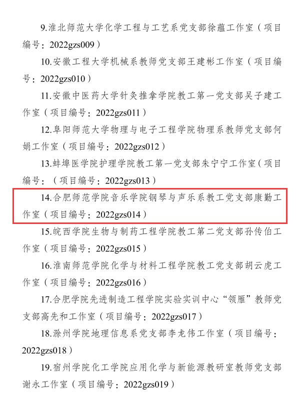 本网讯 近日,中共安徽省委教育工委发布《关于公布首批全省高校“双带头人”教师党支部书记工作室立项建设名单的通知》,首批共遴选建设30个工作室。音乐学院钢琴与声乐系教工党支部康勤工作室获批立项。