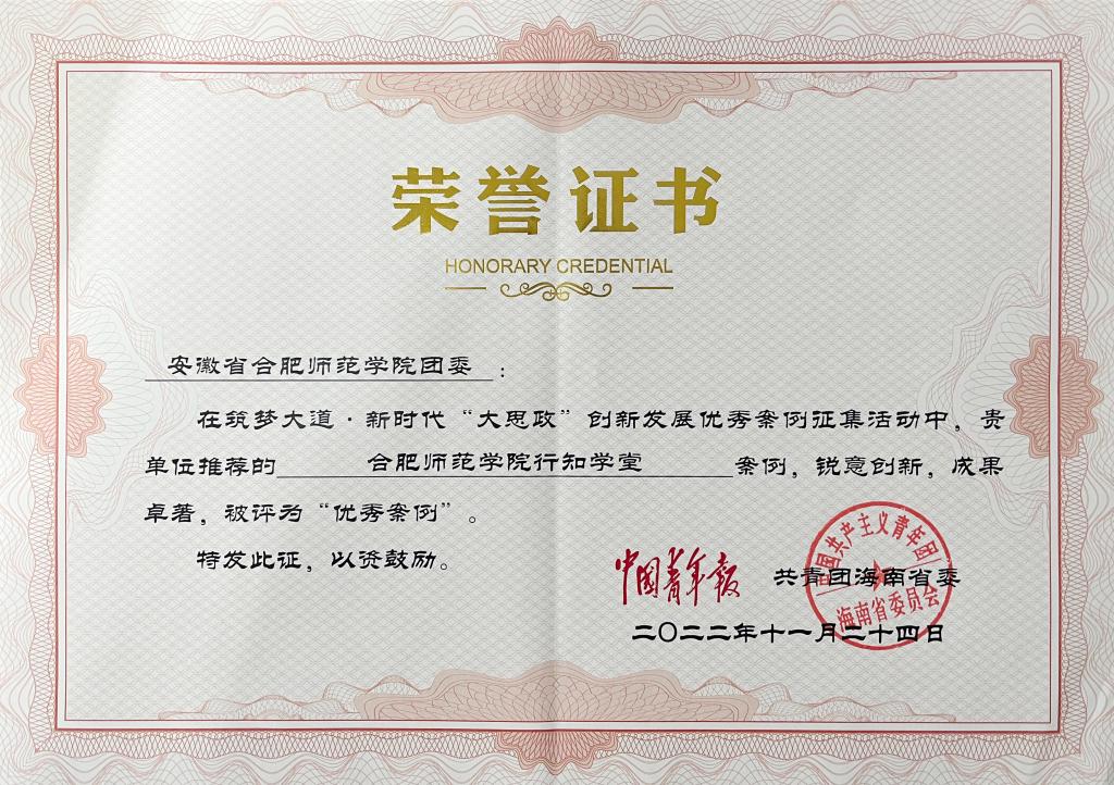 本网讯 近日,中国青年报、共青团海南省委等单位主办的2022年(第二届)中国青年梦想季系列活动筑梦大道·新时代“大思政”创新发展优秀案例征集活动获奖名单公布。我院“行知学堂”项目获评“优秀案例”(全国仅32项,安徽省仅2项,安徽省高校仅1项)。