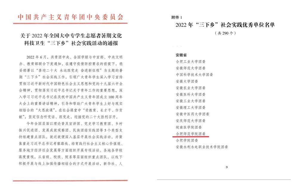 本网讯 近日,共青团中央印发《关于2022年度全国大中专学生志愿者暑期文化科技卫生“三下乡”社会实践活动的通报》,我院获评2022年全国大中专学生志愿者暑期“三下乡”社会实践活动优秀单位,这是我院连续第四年获得此荣誉。